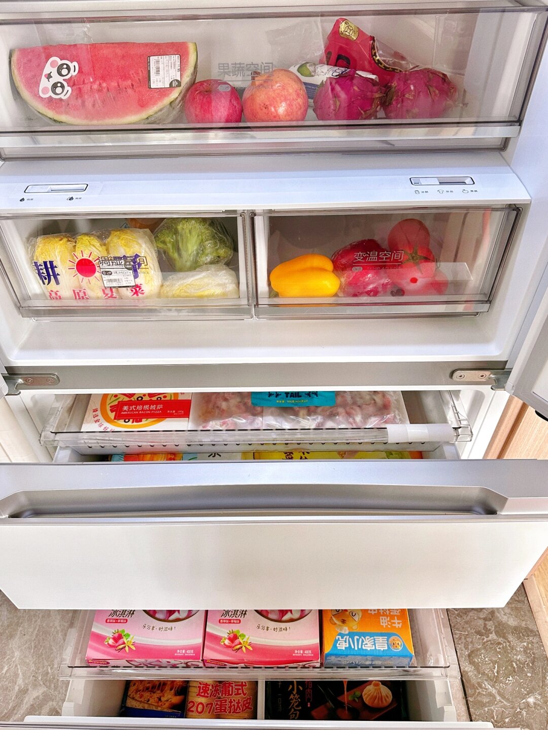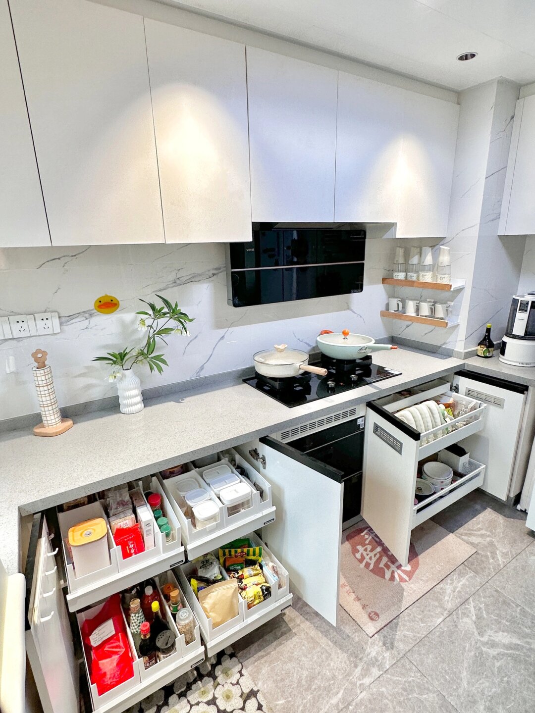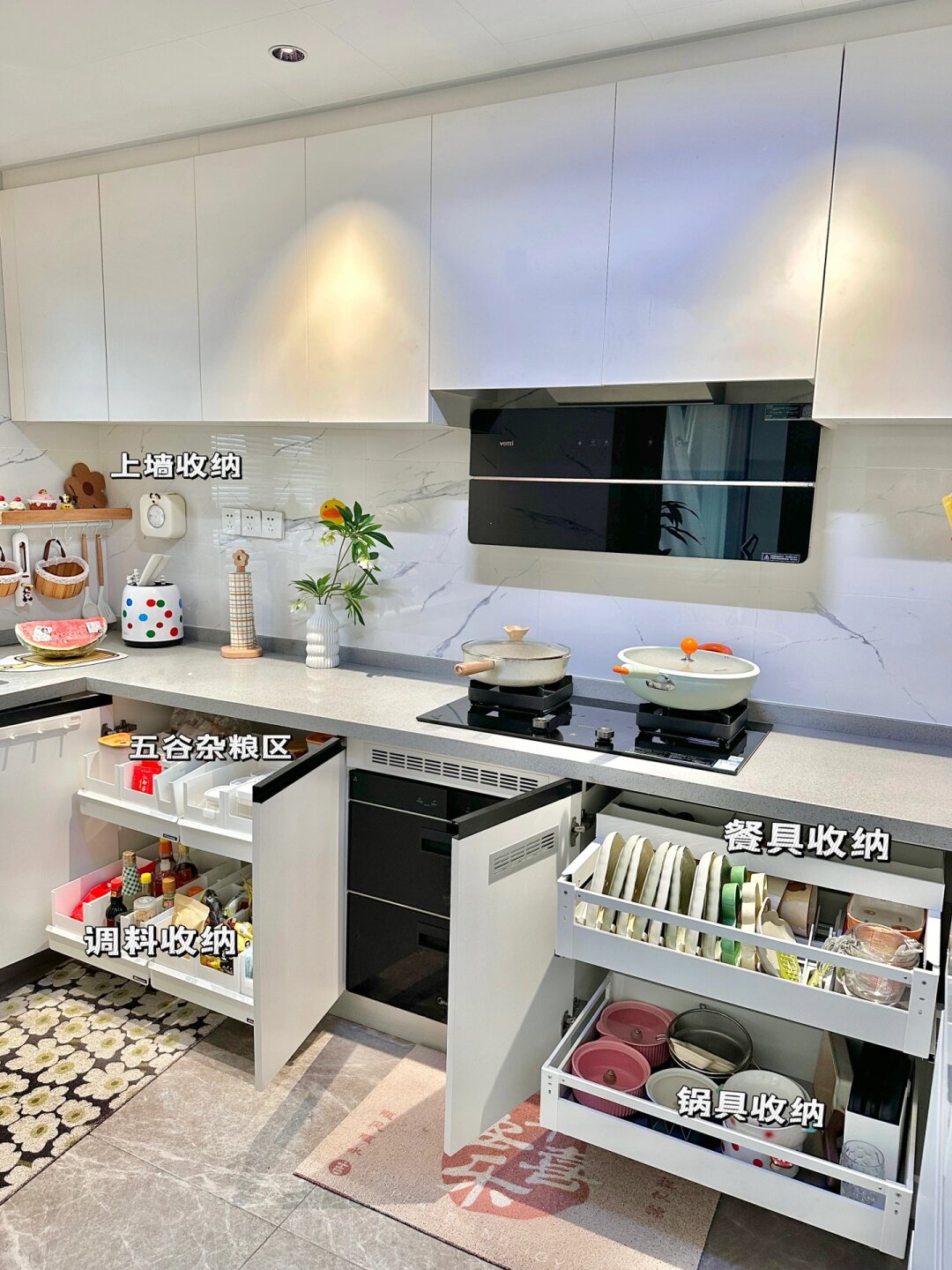 6平米L型厨房这样设计与收纳,真的很实用 这个不到6平米的厨房真的是我家最得意之作,入住一年多真是越住越顺心 今天就给大家总结了最不后悔的5点设计 1合理动线布局: 厨房是整体L型设计,动线分别为洗、切、煮、盛的顺序依次合理布局,使用起来很顺手 2橱柜选的是肤感白,吊柜下吊2cm做了隐形拉手,美观又好打理 3吊顶是铝扣板,地面300*600浅灰色柔光砖,墙面是瓷砖 4橱柜收纳:吊柜上方主要放一些不常用到锅具和餐具!灶台下面的柜子都用拉篮收纳,提高空间利用率,一目了然,拿取餐具更加方便轻松! 5白色冰箱 我家冰箱没有做内嵌式的,所以冰箱上选择就比较自由,选了一个容量很大的白色冰箱,整体跟厨房很搭,平时的囤的食材都能实现分类分区存储 独立的调湿空间,放水果蔬菜都能锁住水分,变温空间放干货也不会返潮 冷冻双层的大抽屉,放各种肉类、速冻食品都没问题 冷藏和冷冻可以全空间的净味,不用担心食物串味,即使是没吃完剩菜放进去也不会串味,保鲜程度真的好 热爱厨房是热爱生活的表现,一日三餐的地方我们都要用心对待,这样井井有条充满烟火气的小厨房,真的是越用越顺心~