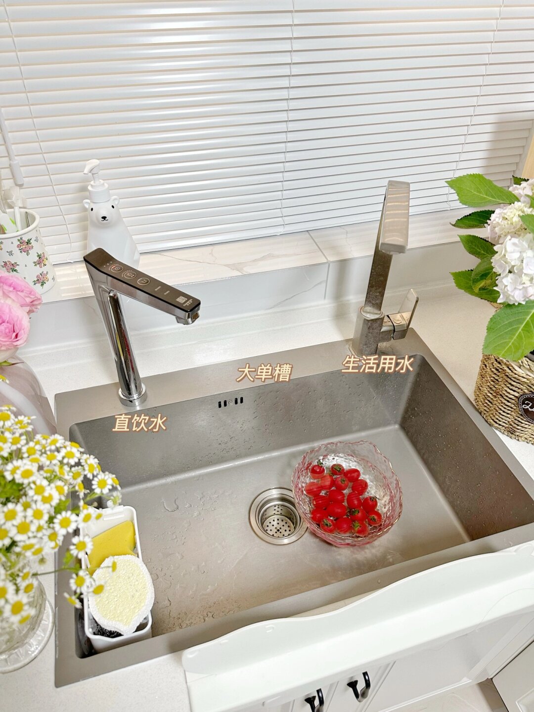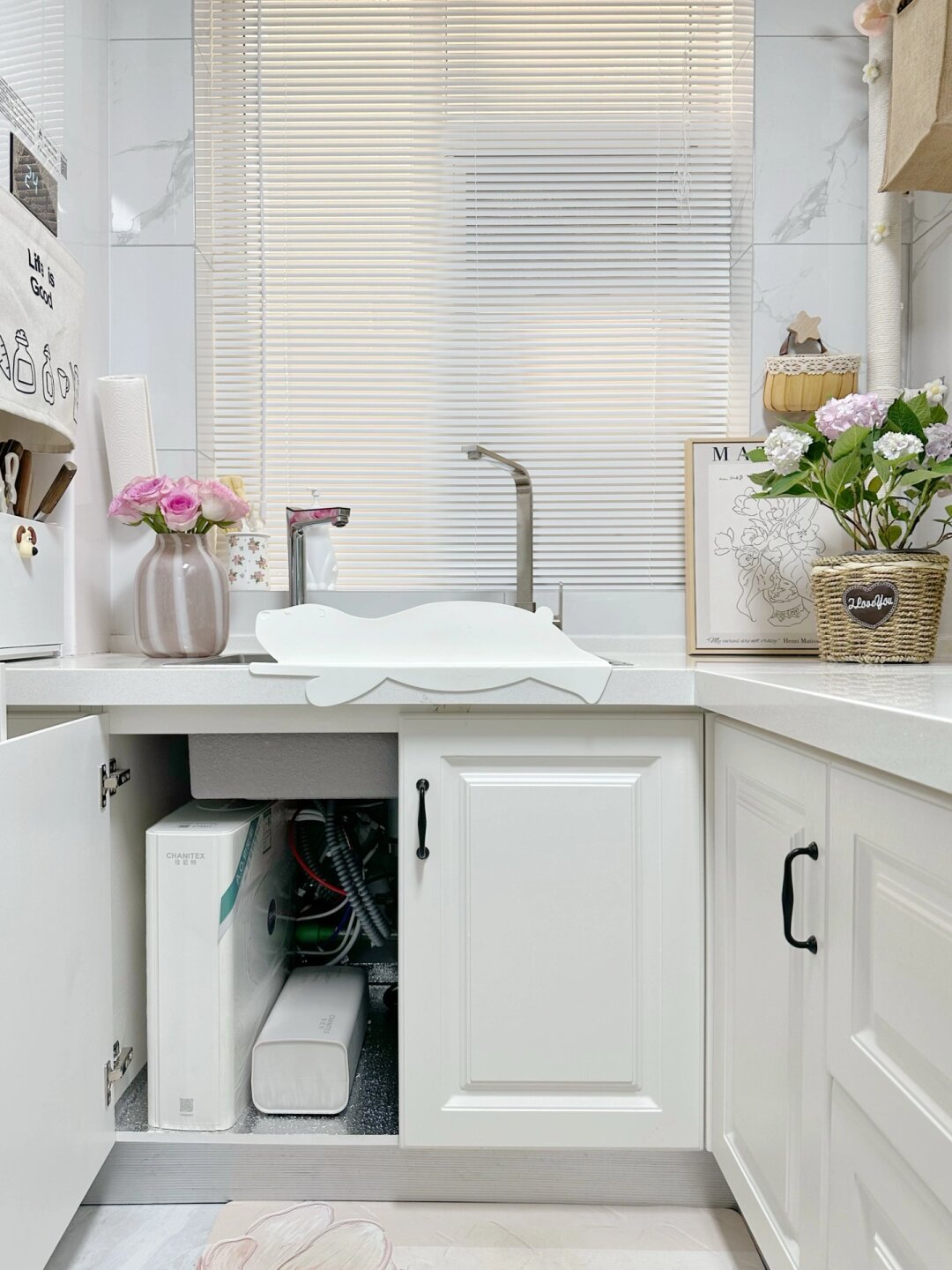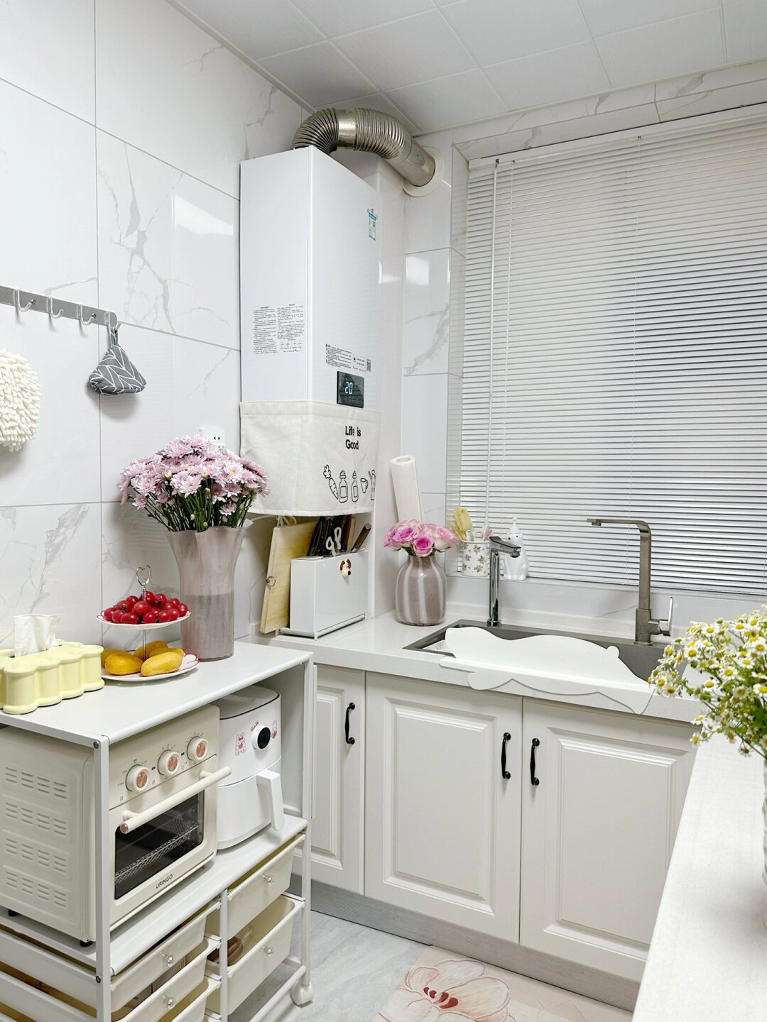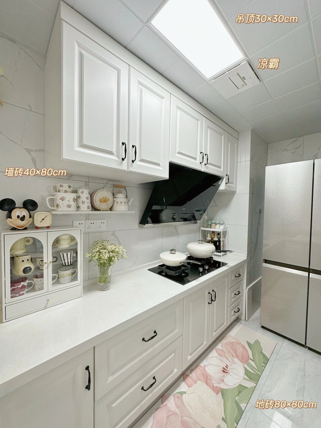 6平米白色小厨房,使用两年的真实感受~ 当初选择白色系厨房是因为采光问题,白色能显得明亮清爽,已经入住两年啦,白色没有想象中那么难打理,有油污及时清理,就能保持的很干净哦,关于我家厨房的一些装修整理在下面啦 厨房尺寸 3.51米×1.77米,共6.2平,标准的L型厨房 吊顶墙砖 吊顶是30×30cm的白色铝扣板,简洁大方 墙面是60×80cm 白底纹路砖 地面是80×80cm的浅灰色地砖 橱柜 柜体是实木多层板,台面是白色石英石 吊柜:高度0.74m,深度0.56m 地柜:高度0.8m,深度0.56m 吊柜与地柜中间间隔0.84m 厨房动线 动线合集做起饭来才能得心应手,从左至右依次是洗菜区→切菜区→电器区→炒菜区→调料区→冰箱。 厨房用水 洗菜池选择了大单槽,空间很大用起来很方便。左边安装了冷热即饮净水器,可以直出饮用水和真开水,减去烧水的烦恼啦~右边是生活用水洗碗洗菜~ 只要养成用完即清理的习惯,再白的厨房也可以保持的很干净哦