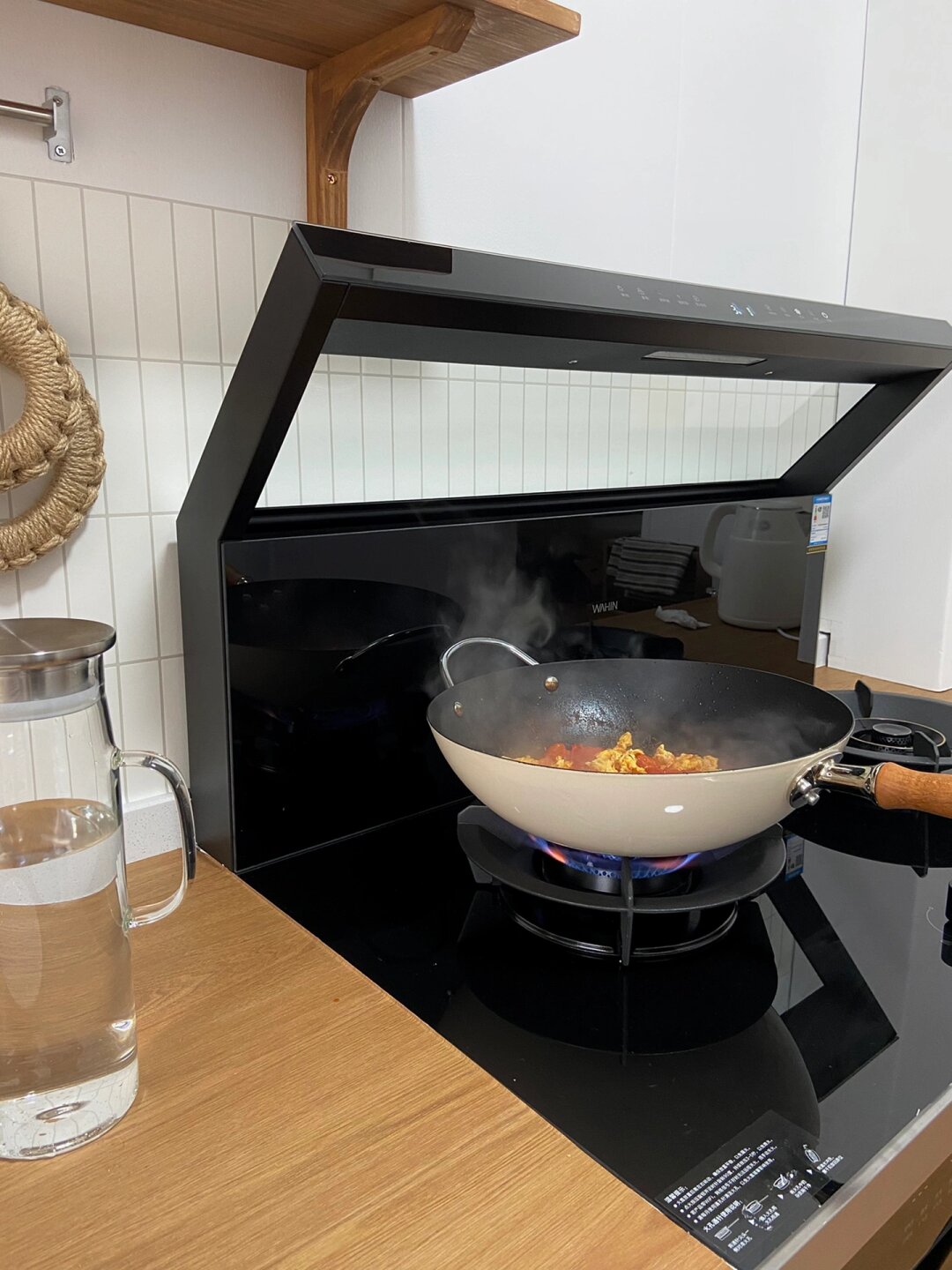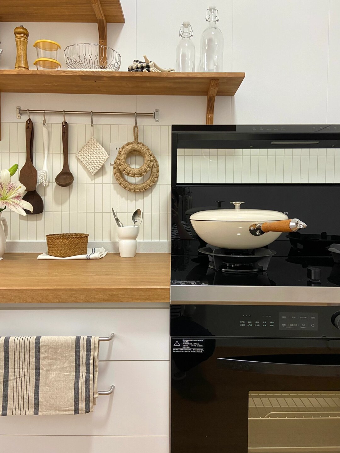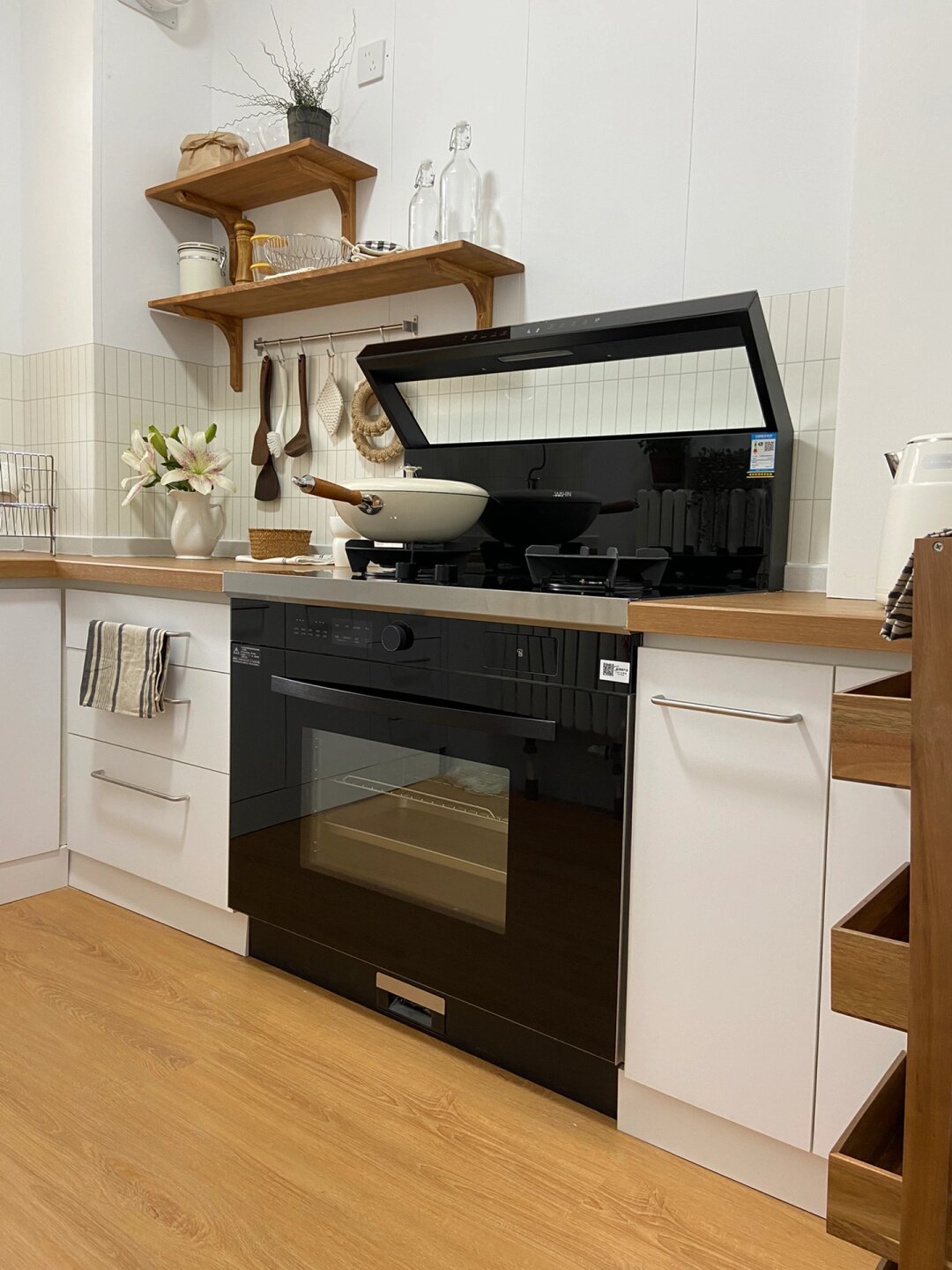 6平米日式厨房|小户型也可以温馨实用的正解 搬到山里 有余,盼了很久的木台面这次终于安排了,厨房总算有个样子啦[微风] - 但是因为小厨房面积不大,没有特别多可发挥的余地,所以设计之初的想法就是温馨实用、节省空间、性价比高。 - 折腾了半个月,从装修、改造、电器选择全部亲力亲为,地板、台面、包管、实木隔板、集成灶、水槽全都是老刘的“作品”,其中我和老刘最满意的部分就是安装了蒸烤一体集成灶,安了这个华凌小透明集成灶之后小厨房更加温馨明亮了!我都爱上做饭了那就总结一下我们选择的原因吧: 1四大功能集成,省钱省地 金厨银卫,该花花该省省,这句话一点也不假,年轻人嘛,什么烤箱、蒸箱、烟机灶具、空气炸锅指定是追求美味生活的标配,不仅支出比例大,小厨房也实在是没有那么多的空间去放置,这是老刘告诉我原则蒸烤一体集成灶的原话,听来也有道理,不仅省了地柜钱还节省了厨房台面的占地面积,综合下来性价比炒鸡高 2低空近吸设计,拒绝油烟满屋[微风] 老刘平时做饭爆炒的时候总是弄的满屋油烟,每次做完菜后都是一个“灰头土脸”,衣服上都是菜味!为了以后能够肆意爆辣爆炒[微风] ,只能靠21m3/min大吸力来满足了。并且近吸设计油烟可以不过脸,哪个女孩子能不爱呢!! 3底部大容量蒸烤箱,功能齐全 60L的大容量平时不管是烤披萨烤肉还是热菜蒸饭,都很方便,外置的水箱设计很人性化,不用打开烤箱门就能加水,更适合烘焙小达人[微风] ,活水直喷的大蒸汽可以很好的锁住水分,口感很是那个!纳米陶瓷图层的内腔打理起来也很轻松,厨房纸一抹就干净了。 - 现在的集成灶越来越普及了,老刘每次用都要夸夸一番,经常待在厨房研究做什么好吃的,生活幸福感直线提升 希望这些分享能给小户型厨房装修的盆友带来参考~