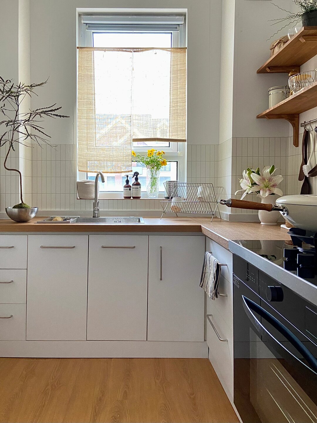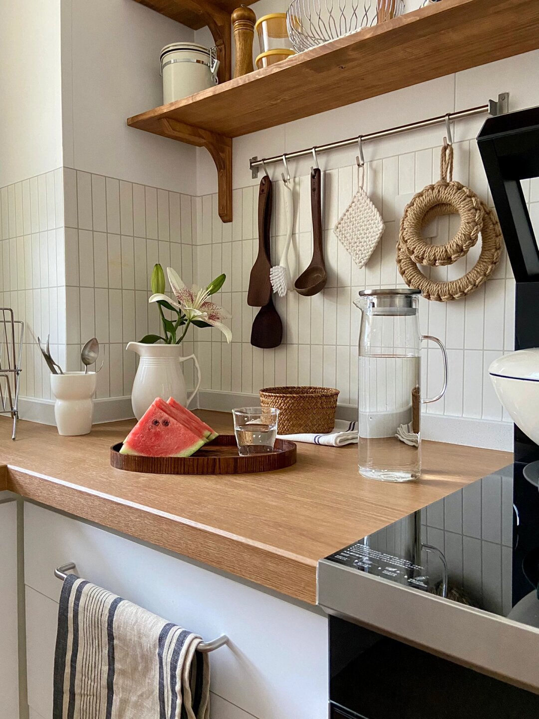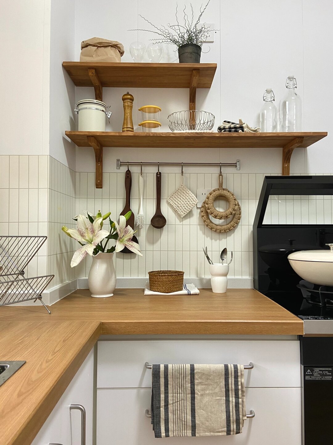 6平米日式厨房|小户型也可以温馨实用的正解 搬到山里 有余,盼了很久的木台面这次终于安排了,厨房总算有个样子啦[微风] - 但是因为小厨房面积不大,没有特别多可发挥的余地,所以设计之初的想法就是温馨实用、节省空间、性价比高。 - 折腾了半个月,从装修、改造、电器选择全部亲力亲为,地板、台面、包管、实木隔板、集成灶、水槽全都是老刘的“作品”,其中我和老刘最满意的部分就是安装了蒸烤一体集成灶,安了这个华凌小透明集成灶之后小厨房更加温馨明亮了!我都爱上做饭了那就总结一下我们选择的原因吧: 1四大功能集成,省钱省地 金厨银卫,该花花该省省,这句话一点也不假,年轻人嘛,什么烤箱、蒸箱、烟机灶具、空气炸锅指定是追求美味生活的标配,不仅支出比例大,小厨房也实在是没有那么多的空间去放置,这是老刘告诉我原则蒸烤一体集成灶的原话,听来也有道理,不仅省了地柜钱还节省了厨房台面的占地面积,综合下来性价比炒鸡高 2低空近吸设计,拒绝油烟满屋[微风] 老刘平时做饭爆炒的时候总是弄的满屋油烟,每次做完菜后都是一个“灰头土脸”,衣服上都是菜味!为了以后能够肆意爆辣爆炒[微风] ,只能靠21m3/min大吸力来满足了。并且近吸设计油烟可以不过脸,哪个女孩子能不爱呢!! 3底部大容量蒸烤箱,功能齐全 60L的大容量平时不管是烤披萨烤肉还是热菜蒸饭,都很方便,外置的水箱设计很人性化,不用打开烤箱门就能加水,更适合烘焙小达人[微风] ,活水直喷的大蒸汽可以很好的锁住水分,口感很是那个!纳米陶瓷图层的内腔打理起来也很轻松,厨房纸一抹就干净了。 - 现在的集成灶越来越普及了,老刘每次用都要夸夸一番,经常待在厨房研究做什么好吃的,生活幸福感直线提升 希望这些分享能给小户型厨房装修的盆友带来参考~