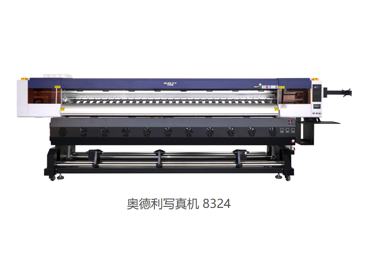 •奥德利8324压电写真机:四头配置,搭配Epson i3200喷头,最大打印宽幅3.2米,每小时可打印64㎡,搭配6600W大功率烘干器,即打即干。
