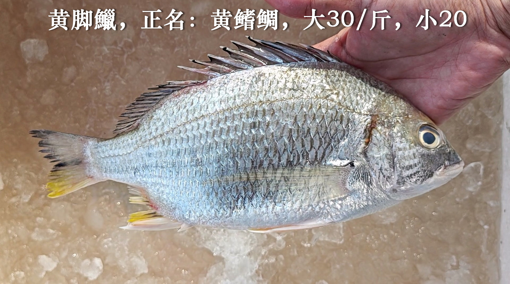 10、黄脚鱲,正名:黄鳍鲷,大30/斤,小20,这些黄脚鱲新鲜,规格也大,大小都好。可能本地人偏爱游水鱼,所以定价偏低。个人觉得是今天性价比最佳口粮鱼。烹调建议:清蒸、油焗、干煎等,各种做法都好。