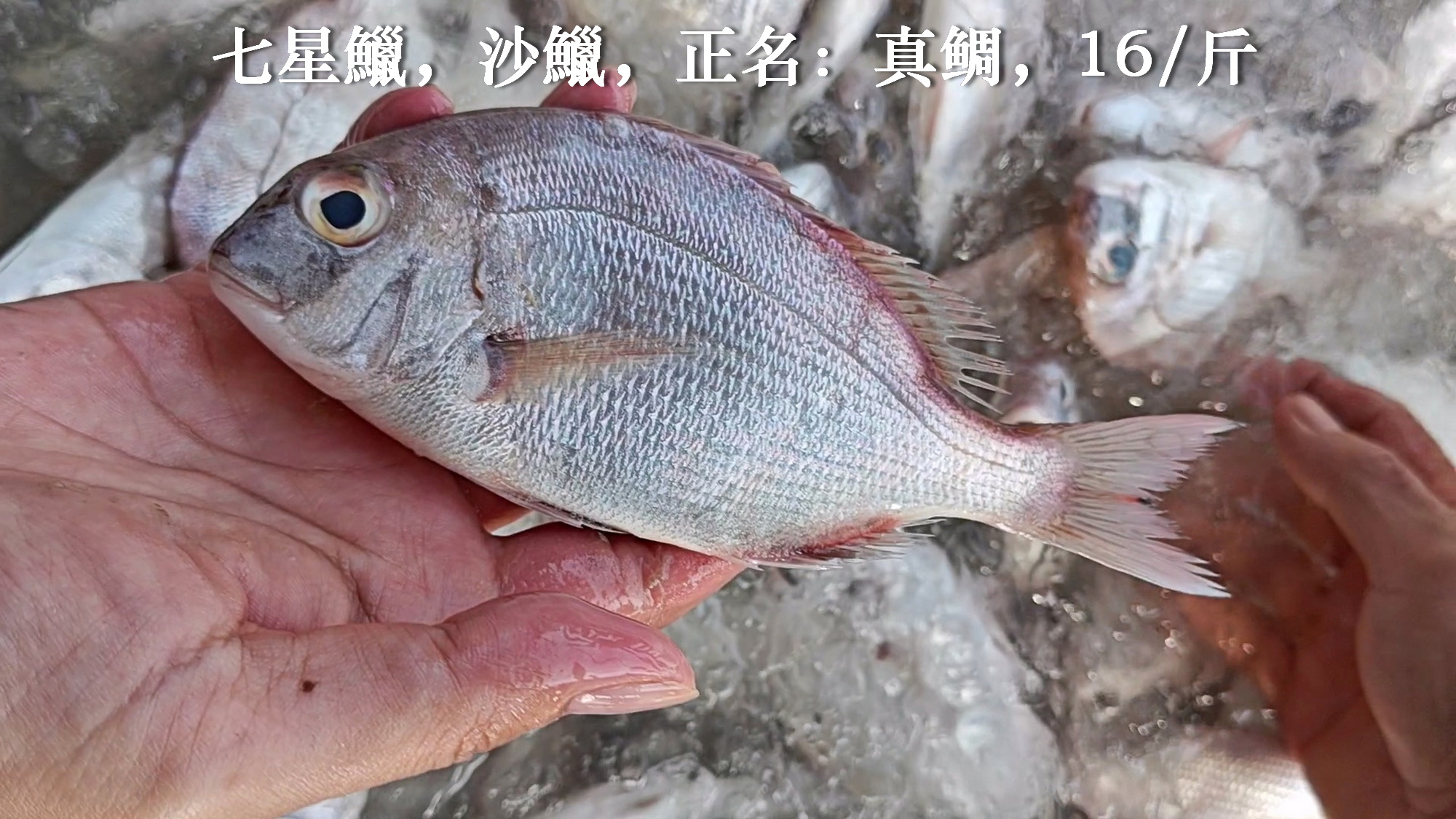 12、七星鱲,沙鱲,正名:真鲷,16/斤,小真鲷的数量很多,小的食味不错,可以买多点做口粮鱼。误标注为波鱲(黄牙鲷)了。烹调建议:干煎、清蒸、焖煮都可。