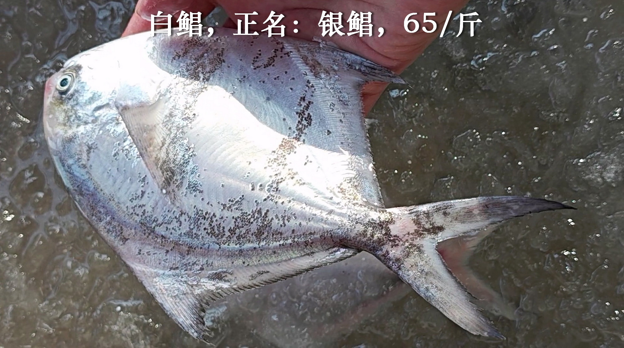 一、鱼类:1、白鲳,正名:银鲳,65/斤,这次没有大斗鲳,也没小的,只有4-5两规格的白鲳。这种江浙叫银鲳,很多人认为它比斗鲳好吃。也能长到很大,但比较少见大规格。烹调建议:各种做法都好吃,清蒸、干煎、焖煮都一流。