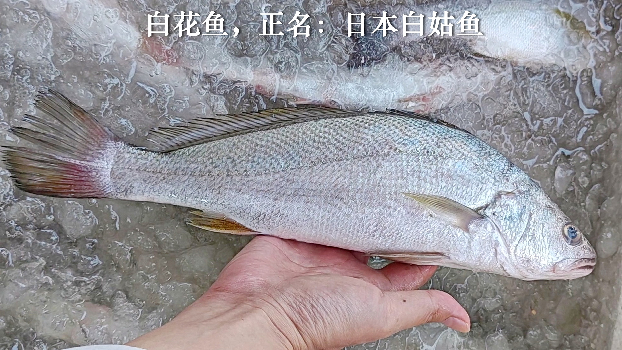 4、白花鱼,正名:日本白姑鱼,可能卖25-30一斤。这个鱼能长到很大,难得见到一大箱的捕获,听说不算好吃,无烹调建议。