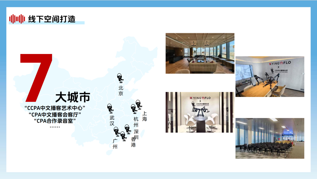 从2023年开始,CPA已经在北京、上海、广州、厦门等多个城市设立CCPA中文播客艺术中心(CCPA)、CPA中文播客会客厅(CPA Hub)等线下空间,帮助创作者进行内容制作,联合开展活动运营,探索多元商业模式。