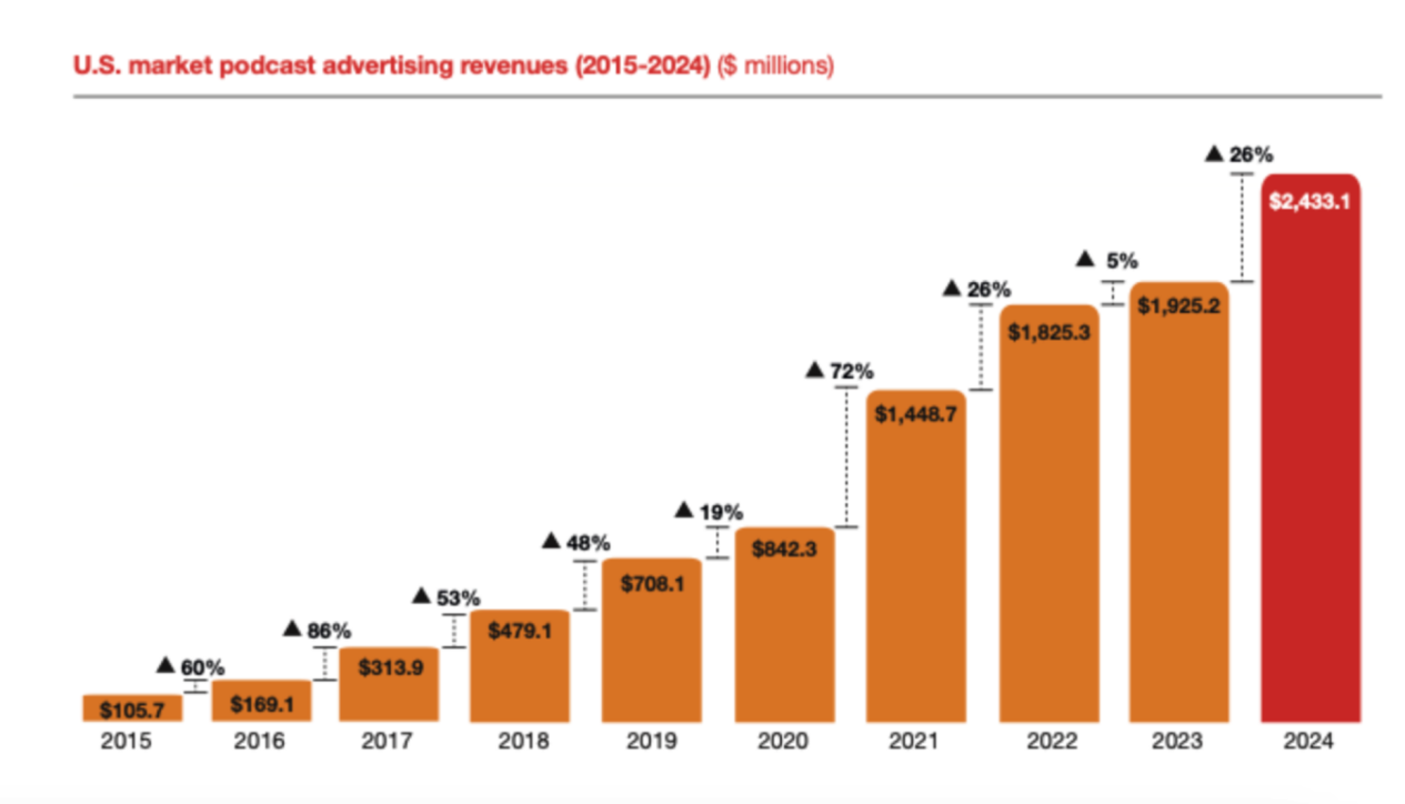 白皮书显示,播客在海内外都在快速成长,并呈现出不同的商业化特征。全球范围来看,仅Youtube平台每个月就有超过10亿人收听或者观看播客;而在苹果播客,经过20年的发展,已经累计280万档节目,超过1亿单集。来自IAB的数据显示,美国播客广告市场规模在2025年达到24亿美元,连续多年保持高双位数增长,成为美国数字广告行业的一抹亮色。