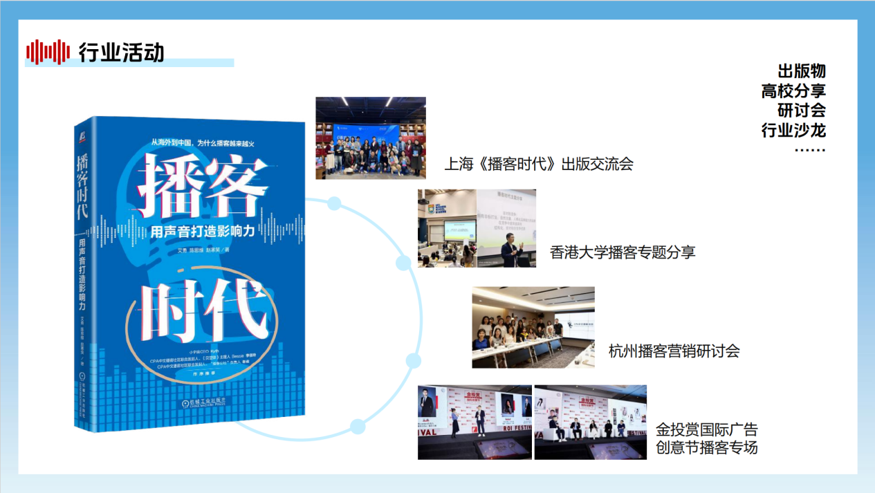 此外,CPA中文播客社区在过去四年里还通过专注研究播客商业化的主题播客《CPA超频对话》、一年一度的《CPA中文播客白皮书》,以及新近出版的《播客时代:用声音打造影响力》,持续关注、记录和推动中文播客的商业化进程。