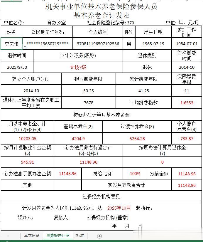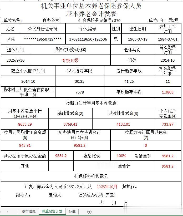 2、李先生1965年7月出生,1984年7月参加工作,经新政策延迟两个月后,于2025年9月60岁零2个月时退休;根据退休年龄确定的个人账户养老金和职业年金计发月数为137.8个月;退休时仍用2024年的计发基数7678元计算预发养老金;