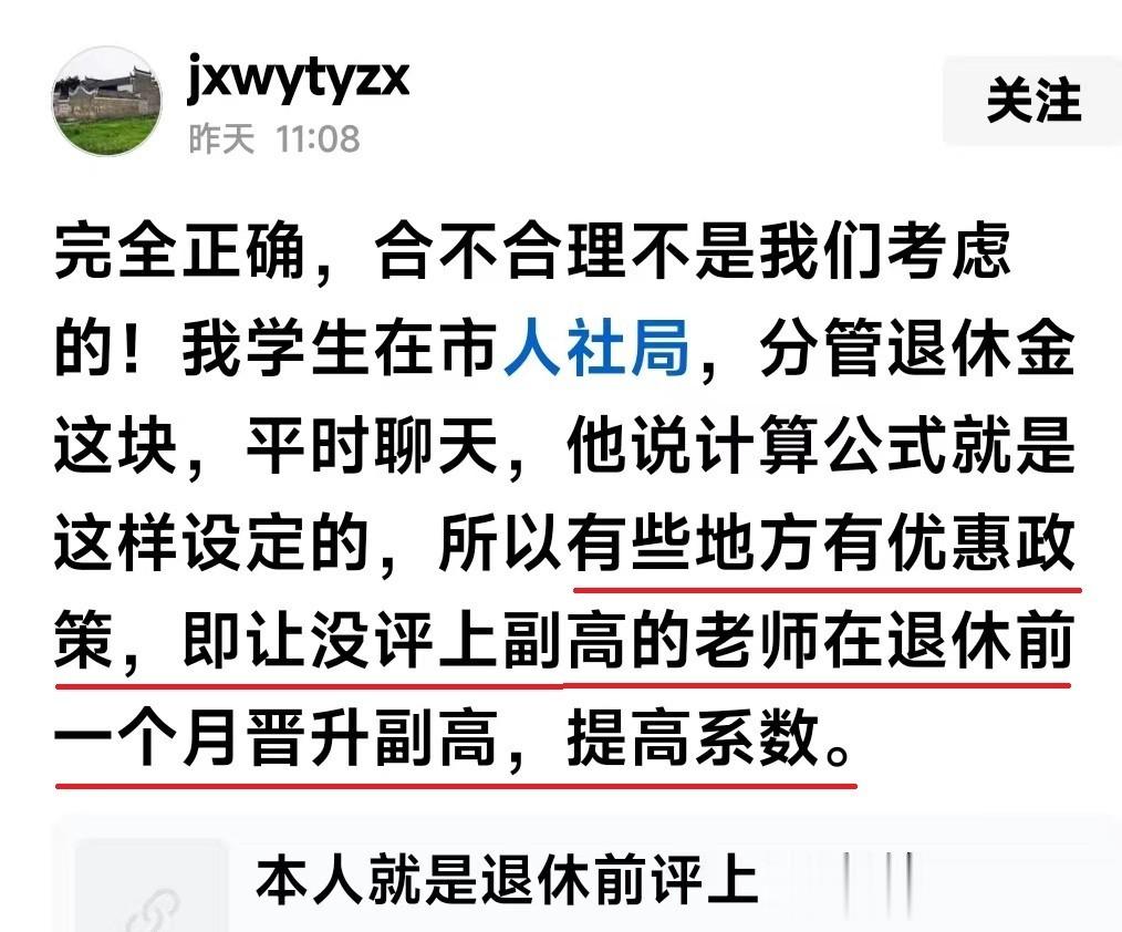 “……所以有些地方有优惠政策,即让没评上副高的老师在退休前一个月晋升副高,提高系数。”