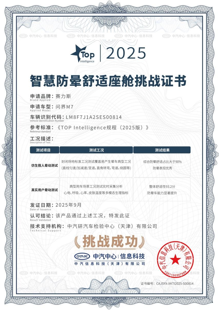 近日,中汽中心公布《TOP intelligence规程(2025版)》标准下的最新评测结果,全新问界M7顺利通过该标准下的“智慧防晕舒适座舱”专项挑战,展现出在舒适驾乘领域的硬核实力。据了解,此次挑战创新性采用双维度评估体系,不仅全面覆盖日常用车中易诱发晕车的各类典型场景,更以人因科学量化的检测方式,对车辆防晕能力水平进行了系统性、深层次的验证。