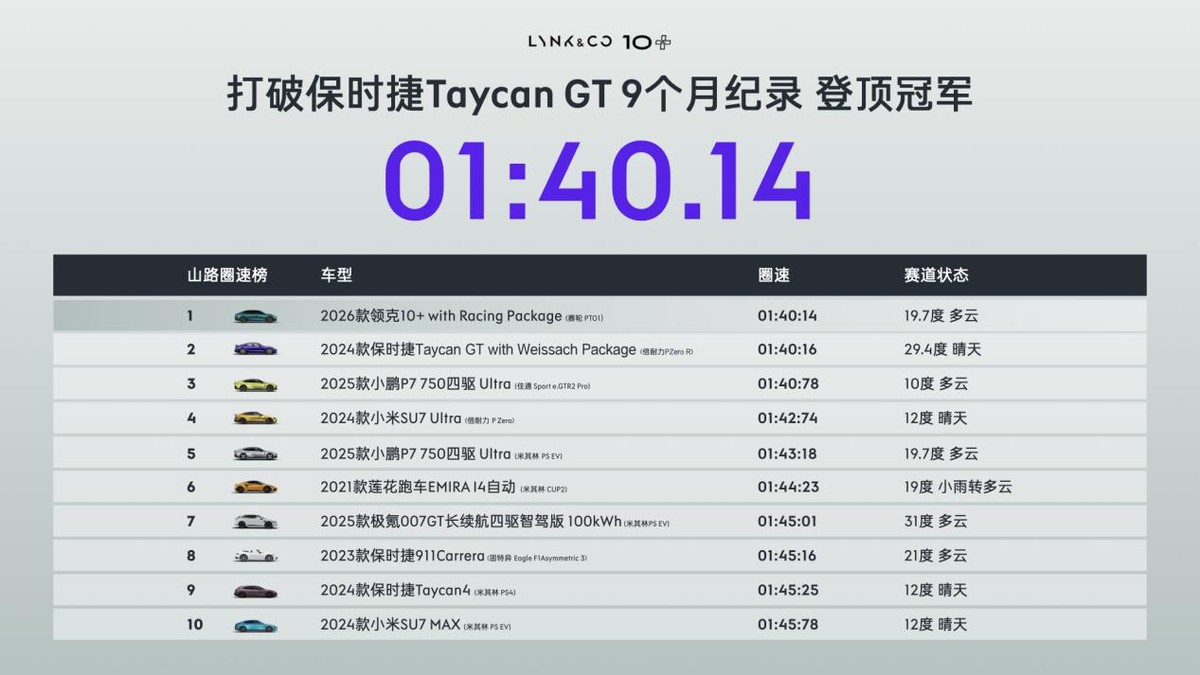 与此同时,领克首次以“+”之名打造的极致运动座驾领克10+,联合领克汽车运动的赛道级调校并在官方性能套件的赋能下,领克10+ with Racing Package以1分40秒14的山路圈速成绩超越保时捷Taycan GT,取得亚洲山脊赛道圈速第一并登顶“弯道之王”,进一步强化了领克在纯电运动领域的引领地位。