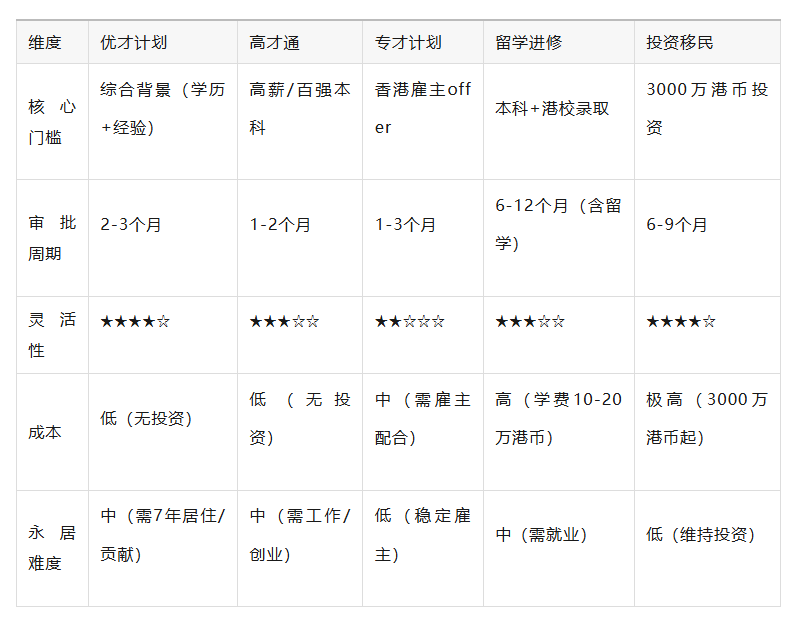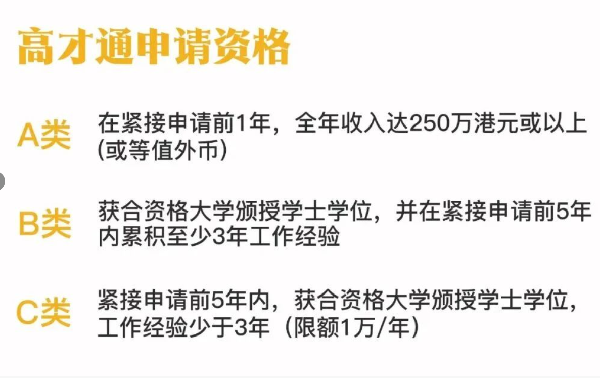 综合计分制:需满足12项指标中的6项(如3年名企工作经验、年薪50万+港币、硕士学历等)。
