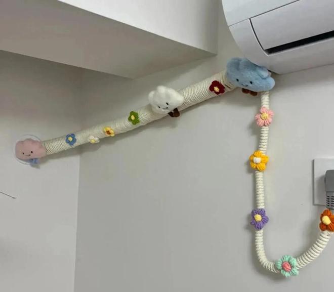 对于壁挂机空调来说,就更简单了,就是缠麻绳+装饰物,就是用一串花把管道缠起来。