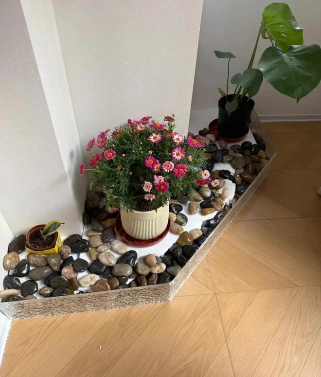 还可以在上面放了一些鹅卵石,还有两个盆栽,就变成小花池。