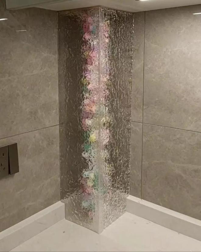 如果说,只是地柜和吊柜中间的一节燃气管道,师傅没用大理石给包上的话,可以用石头纹亚克力遮起来,里面放上一些五颜六色的毛球,朦朦胧胧的,非常好看!