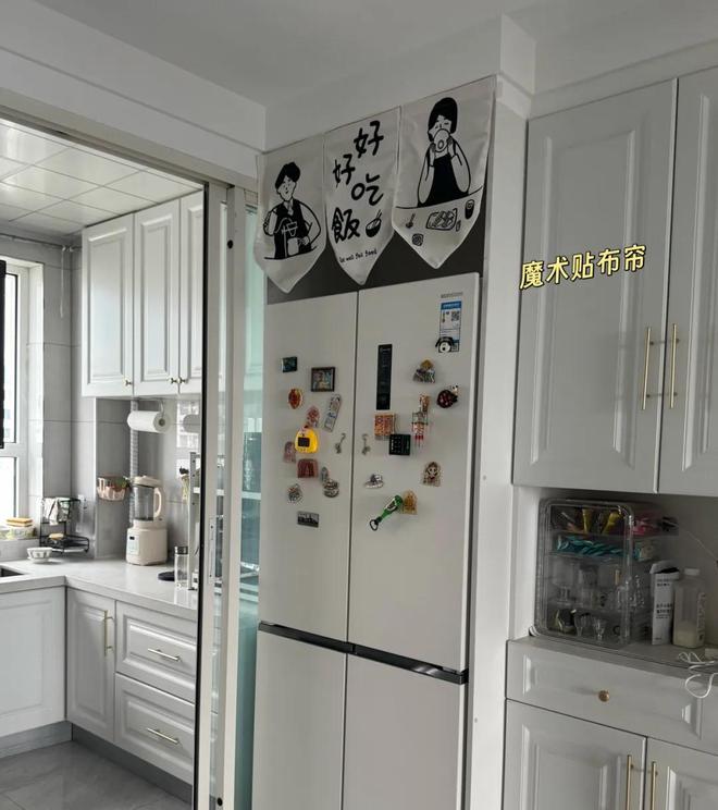 装上这种布帘后,不会影响到冰箱的散热效果,同时还属于厨房的“亮点”设计,不知道的还以为是有意这样做的。