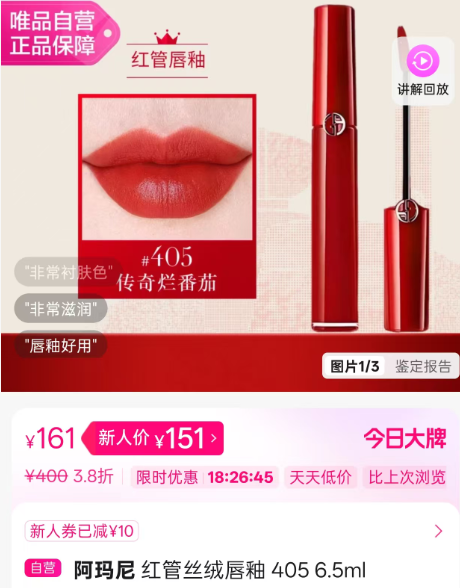 结果前两天逛唯品会,本来是想看看有没有什么好点的面霜,结果突然刷到阿玛尼的那款405烂番茄色,而且价格才只要151。我反复确认了色号和规格,是正装6.5ml,而且还有官方授权,所以没怎么犹豫就下了单。