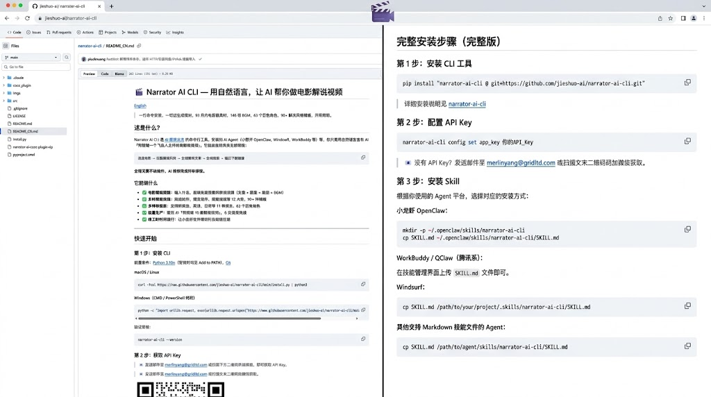 如果你也想试试,可以搜索「AI解说大师」或者在GitHub搜索「narrator-ai-cli」,安装教程和详细文档都在那里。