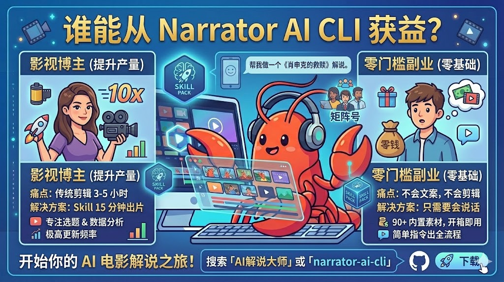总结一下,AI解说大师这次上线的Skill,本质上是给你的AI Agent装上了"电影解说制作"这个专业技能。装上之后,你只需要说话,AI帮你完成从文案到成片的全部流程。