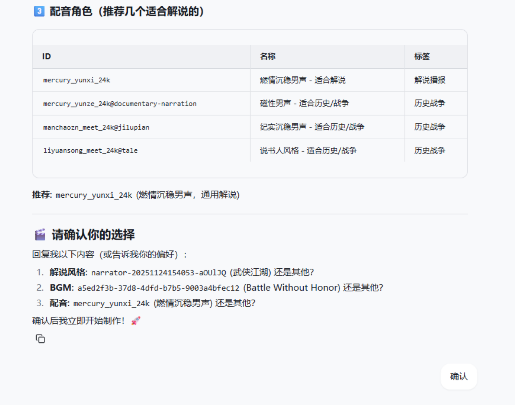 比如文案生成完之后,AI会先给你看一遍,你觉得哪里不对可以直接说"把第三段改成更搞笑的风格",它会重新生成。改完满意了再继续执行后面的配音和剪辑。