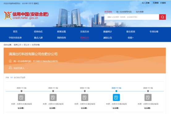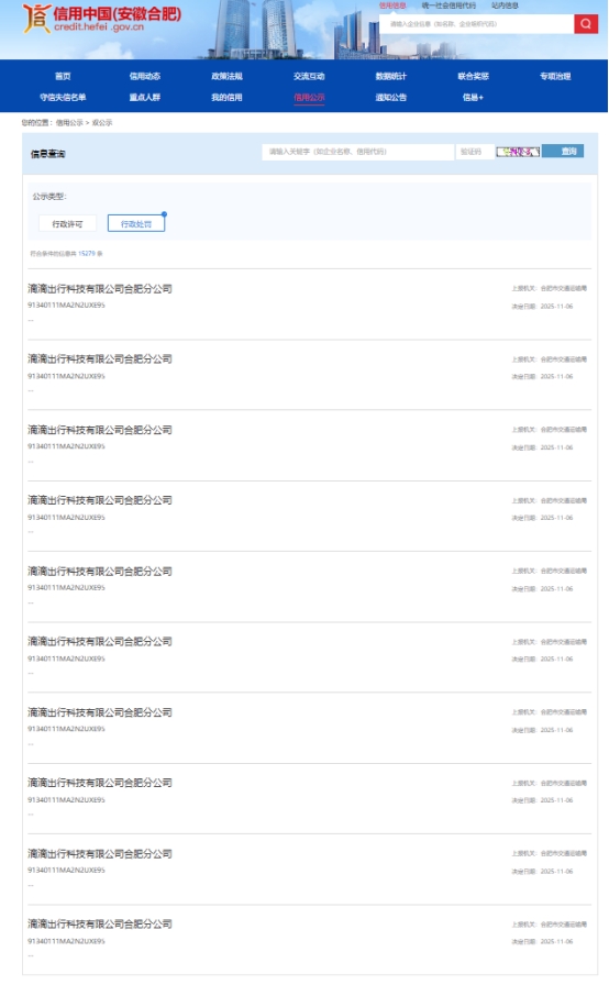 近日,据信用合肥信息,合肥市交通运输局披露多条行政处罚信息,剑指滴滴出行科技有限公司合肥分公司。该公司因提供服务车辆未取得《网络预约出租汽车运输证》《网络预约出租汽车驾驶员证》,同日连收24条罚单,合计12万元。