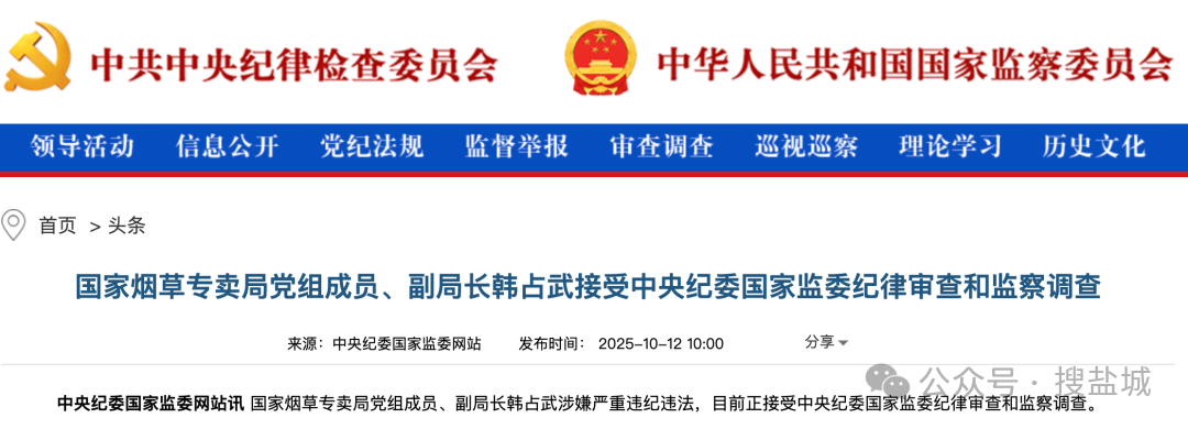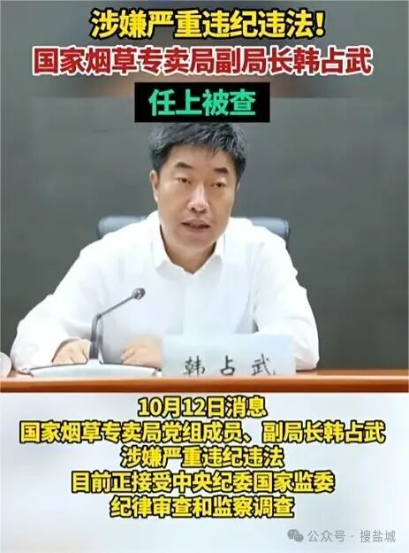 近日,中央纪委国家监委官网发布重磅消息:国家烟草专卖局党组成员、副局长韩占武因涉嫌严重违纪违法,正接受纪律审查和监察调查。这一消息迅速引发社会广泛关注,韩占武也成为党的十八大以来,烟草系统第七位被查的省部级“大老虎”,被舆论称为“第七只烟草虎”,再次彰显党中央坚定不移推进反腐败斗争的坚强决心。