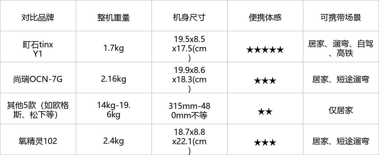 尚瑞OCN-7G和氧精灵102也是便携款,但重量分别是2.16kg和2.4kg,比町石重一点,长时间背着会有点累,机身尺寸也略大,便携体感不如人意,适合短途遛弯携带,长途携带就有点费劲了。