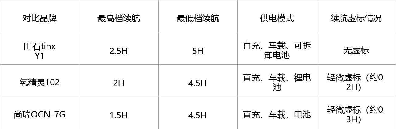 测评方法:将3款便携制氧机(町石tinx Y1、氧精灵102、尚瑞OCN-7G)全部充满电,分别调至最高档和最低档,持续运行,记录续航时长,测试供电模式是否多样,是否存在续航虚标情况。
