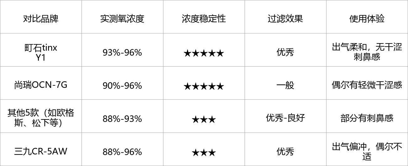 第三梯队的氧精灵102和三九CR-5AW,氧浓度波动比较大,氧精灵实测在83%-96%之间,偶尔会低于医用级标准,三九CR-5AW出气偏冲,偶尔会有不适,日常保健勉强够用,但体验不如前两个梯队。