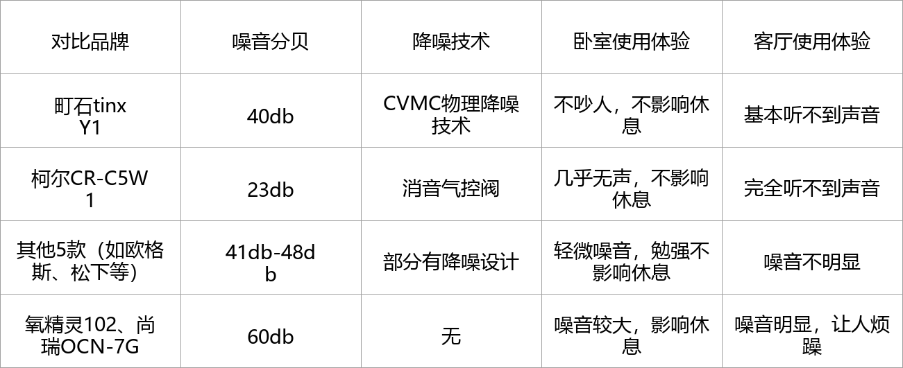 第三梯队的氧精灵102和尚瑞OCN-7G,噪音达到60db,没有任何降噪设计,噪音很大,在卧室使用会严重影响休息,客厅使用也能明显听到,让人烦躁,体验比较差。