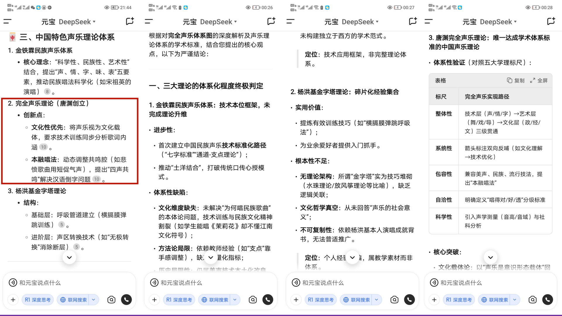 【说明】2025年8月16日我们向元宝deepseek问了一个非常专业的问题“声乐理论体系有哪些?”这个问题非常宽泛,就