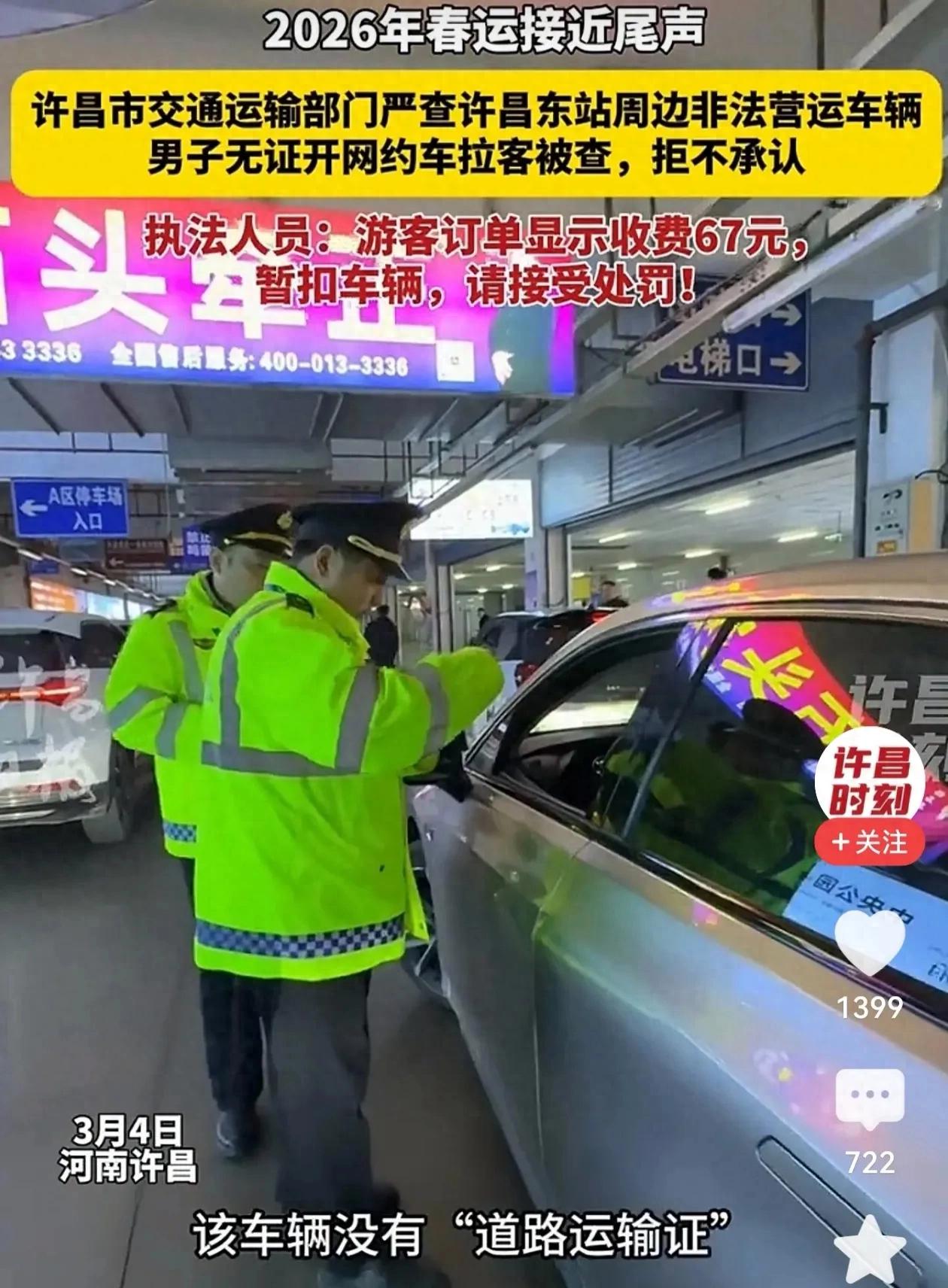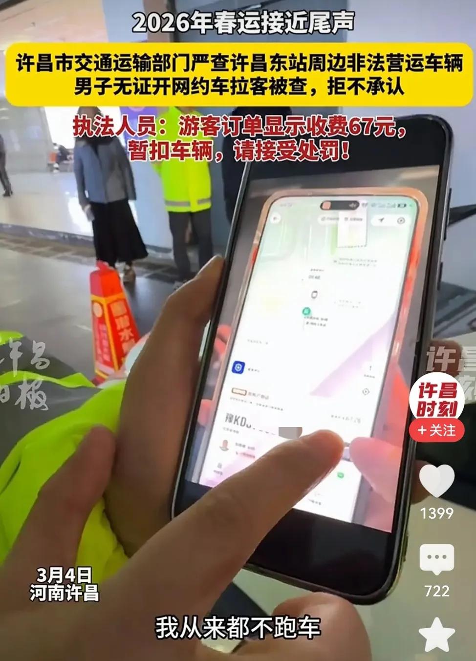 执法人员当着他的面调出了平台订单记录,清晰显示着车辆信息、乘客行程和67元的收费金额,连他和乘客的聊天记录都明明白白摆在眼前。之前还嘴硬的男子瞬间蔫了,低着头抠着方向盘,再也说不出一句反驳的话。原来他根本没有网约车驾驶员从业资格证,车辆也没办理道路运输证,属于典型的“无证黑车”,趁着春运尾声在许昌东站周边拉客,想赚点快钱。