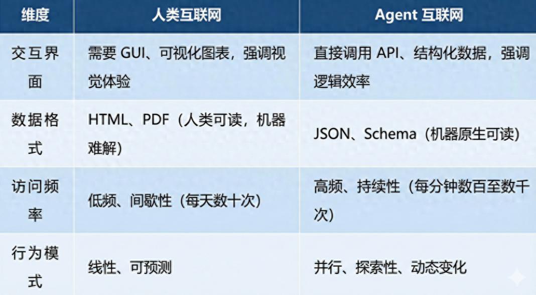 然而,现有的互联网是为人类设计的,而非为 Agent 设计的。这导致了一个巨大的范式鸿沟(如下表所示):