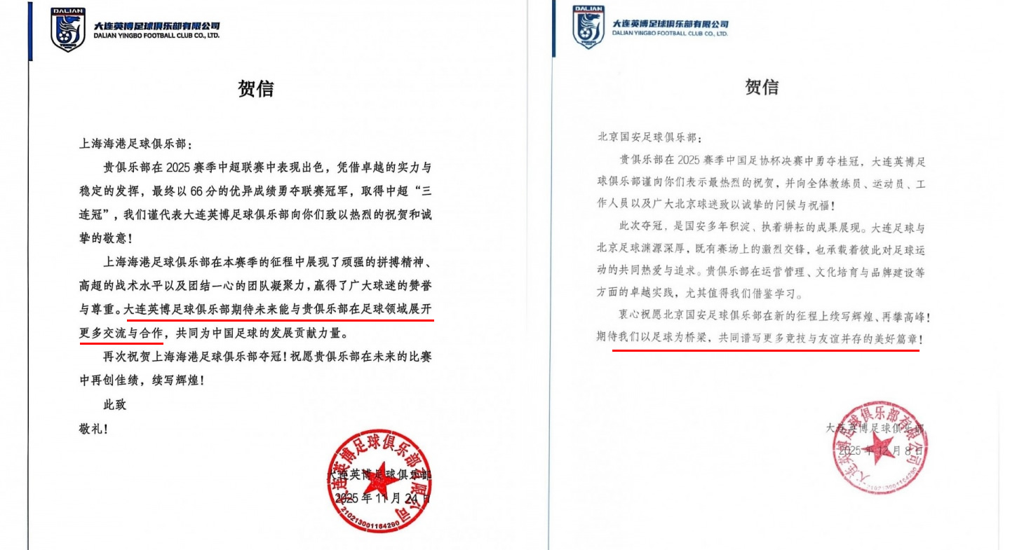 对于上港,贺电中表示希望双方俱乐部未来在足球领域展开更多的合作交流。刘祝润从海港租借到大连英博表现不错,这应该也是大连英博重点提及这点的原因。对于北京国安,贺电中则重点谈及双方的友谊,表示希望双方以足球为桥梁,共同谱写竞技和友谊并存的美好篇章。