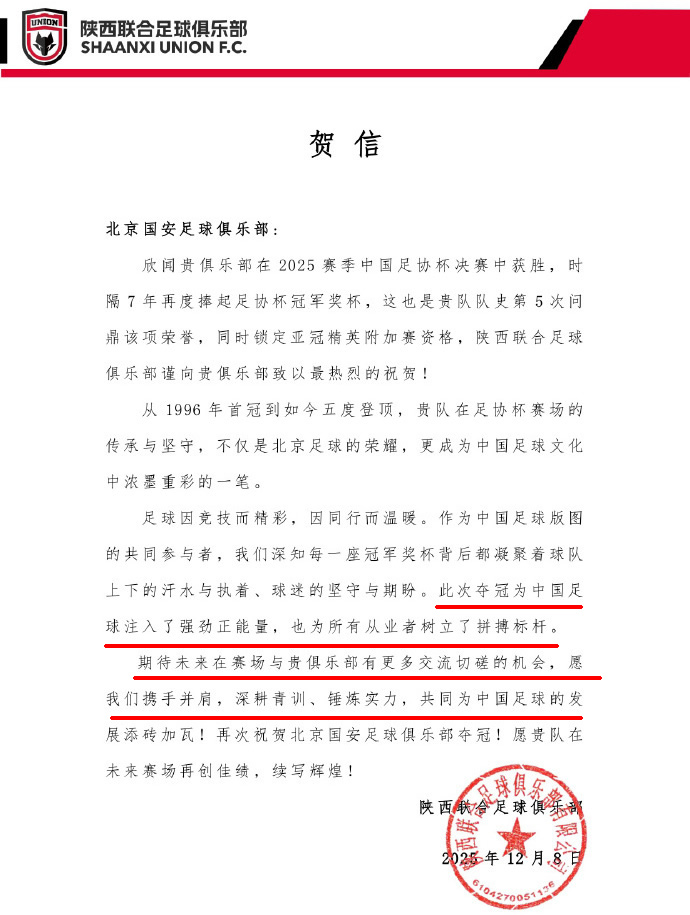 足协杯夺冠后,还有一支中甲球队给北京国安发出贺电,他们就是陕西联合足球俱乐部(上图)。该俱乐部称赞北京国安的夺冠,是为中国足球注入强劲的正能量,也为所有从业者树立拼搏标杆。最后他们希望跟北京国安在青训上有更多切磋交流。