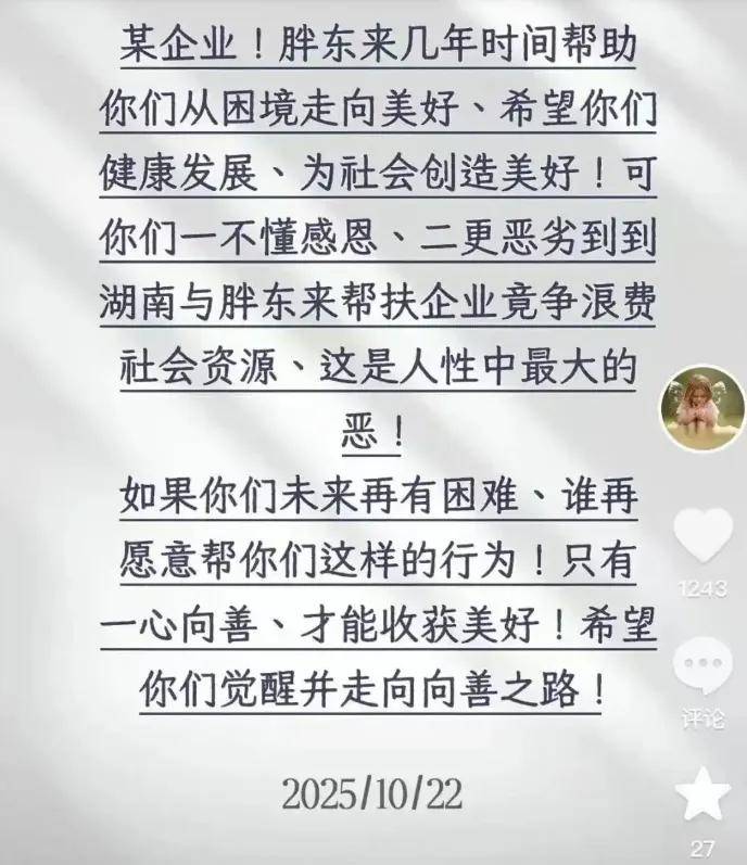 于东来在社交媒体上发布动态,他表示:某企业胖东来几年时间帮助你们从困境走向美好,希望你们健康发展,为社会创造美好!可你们一不懂感恩,二更是恶劣到湖南与胖东来帮扶企业竞争浪费社会资源,这是人性中最大的恶。