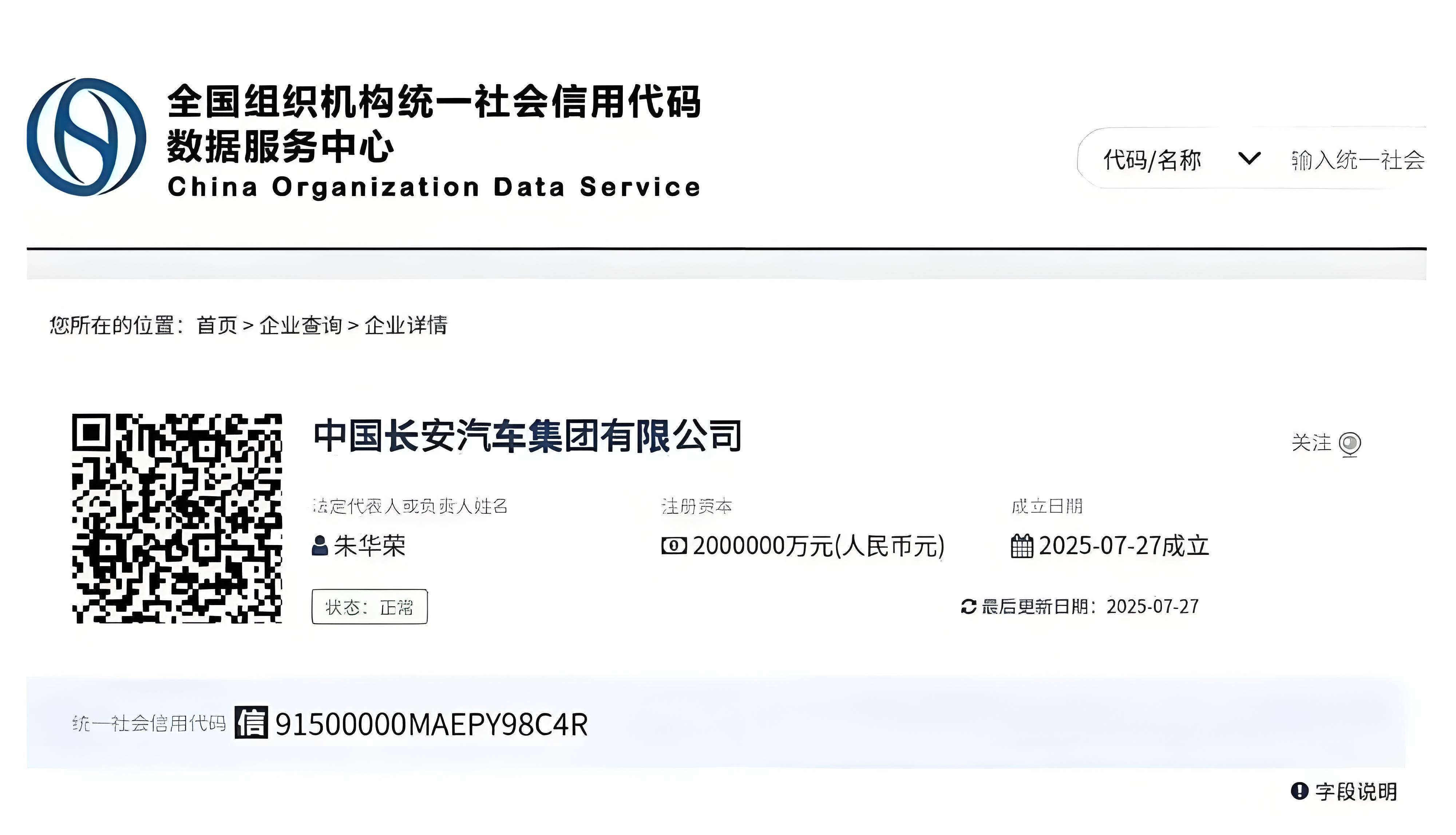 7月27日,中国长安汽车集团在重庆成立,注册资本200亿元,法定代表人朱华荣,业务涵盖新能源汽车销售及零部件研发。7月28日,其官方账号上线,朱华荣发文“向新出发”。