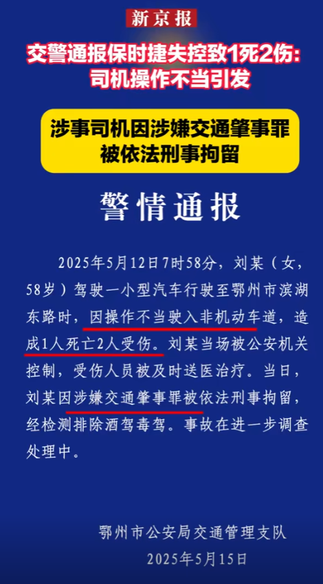 保时捷失控致1死2伤,鄂州交警通报:女子操作不当引发,已被刑拘