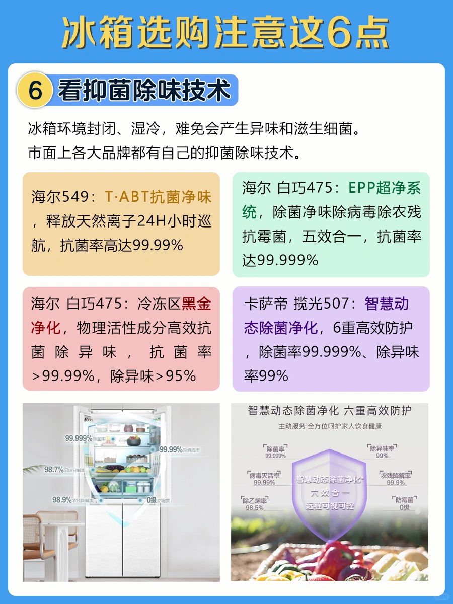 市面上各大品牌都有自己的抑菌除味技术。如海尔549的T·ABT抗菌净味,海尔 白巧475的EPP超净系统和冷冻区黑金净化,卡萨帝 揽光507的智慧动态除菌净化。