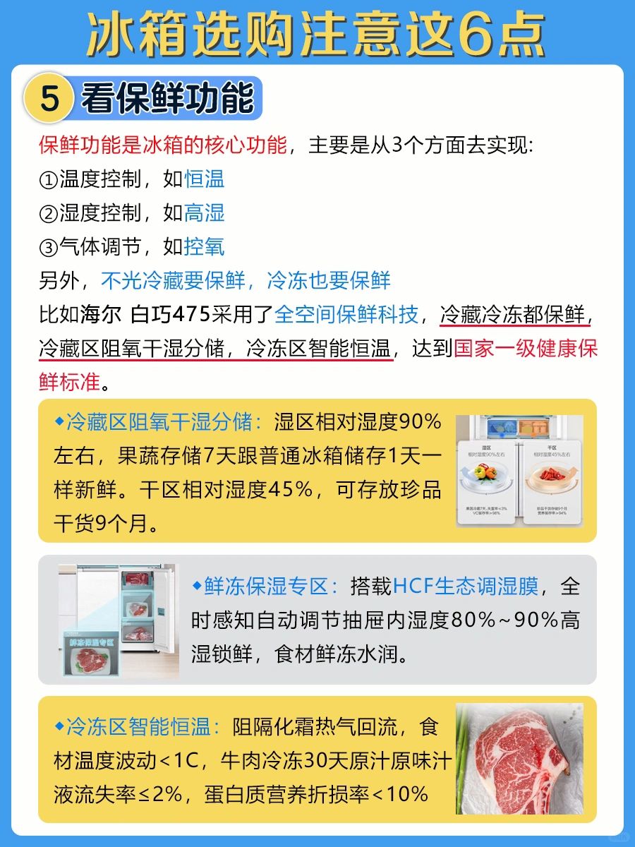比如海尔 白巧475采用了全空间保鲜科技,冷藏冷冻都保鲜,冷藏区阻氧干湿分储,冷冻区智能恒温,达到国家一级健康保鲜标准。