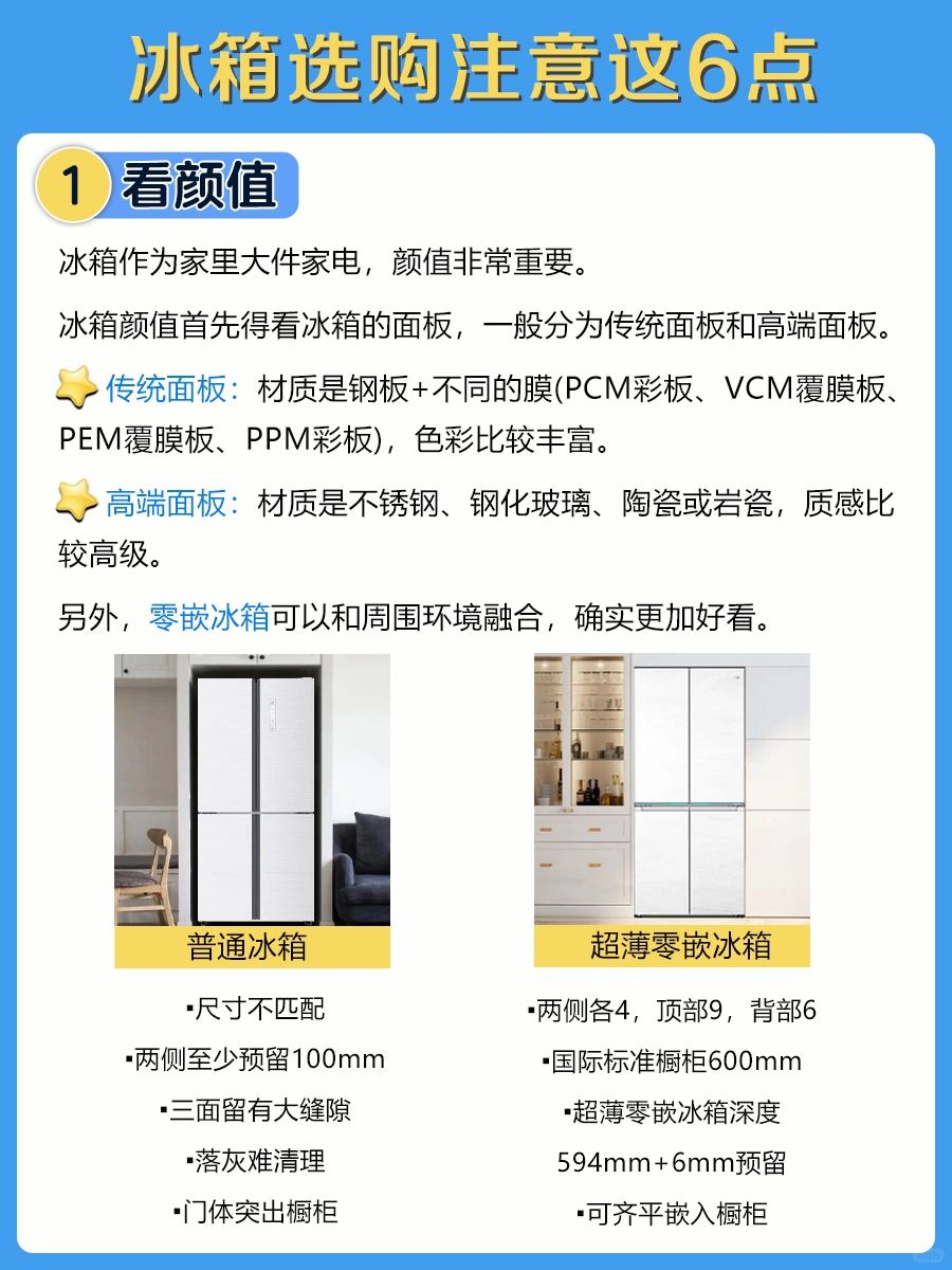 冰箱颜值首先得看冰箱的面板,分为传统面板和高端面板,各有优点,根据喜好选择。
