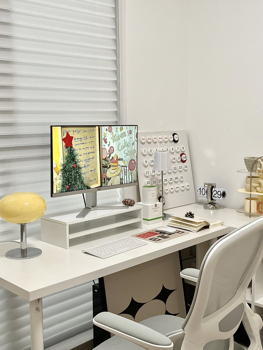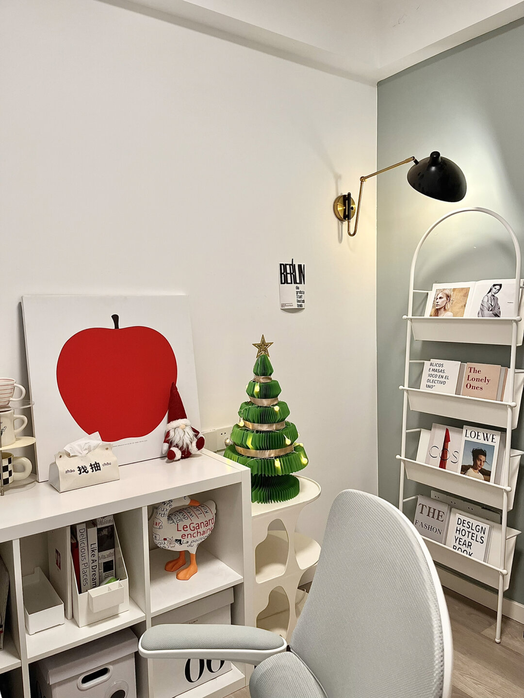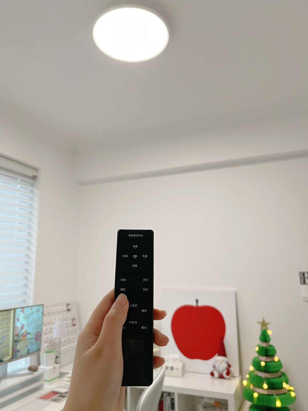 6平书房装修|入住一年还是换了护眼吸顶灯! [微风] 书房尺寸:2.55*2.65m,层高2.8米 [微风] 乳胶漆颜色:伦敦雾[微风] 白色 [微风] 护眼吸顶灯:尺寸40.2*5cm,无极调光22瓦 [微风] 窗户是落地窗,做了香格里拉百叶帘 [微风] 放了宜家的L型半围书桌,书桌1.2米,八格柜1.4米 [微风] 我经常居家办公,对着电脑眼睛总是很疲惫,所以卧室换上了护眼吸顶灯 这款是全光谱护眼吸顶灯,无蓝光危害,能更好的保护视力。显色数是Ra > 97的,就是色度越高,色彩还原度才越好。还可以无极调光,调节色温和亮度,三色光源满足日常需求。颜值也是极简耐看,好搭配,任何风格的装修都能驾驭,也不容易过时。