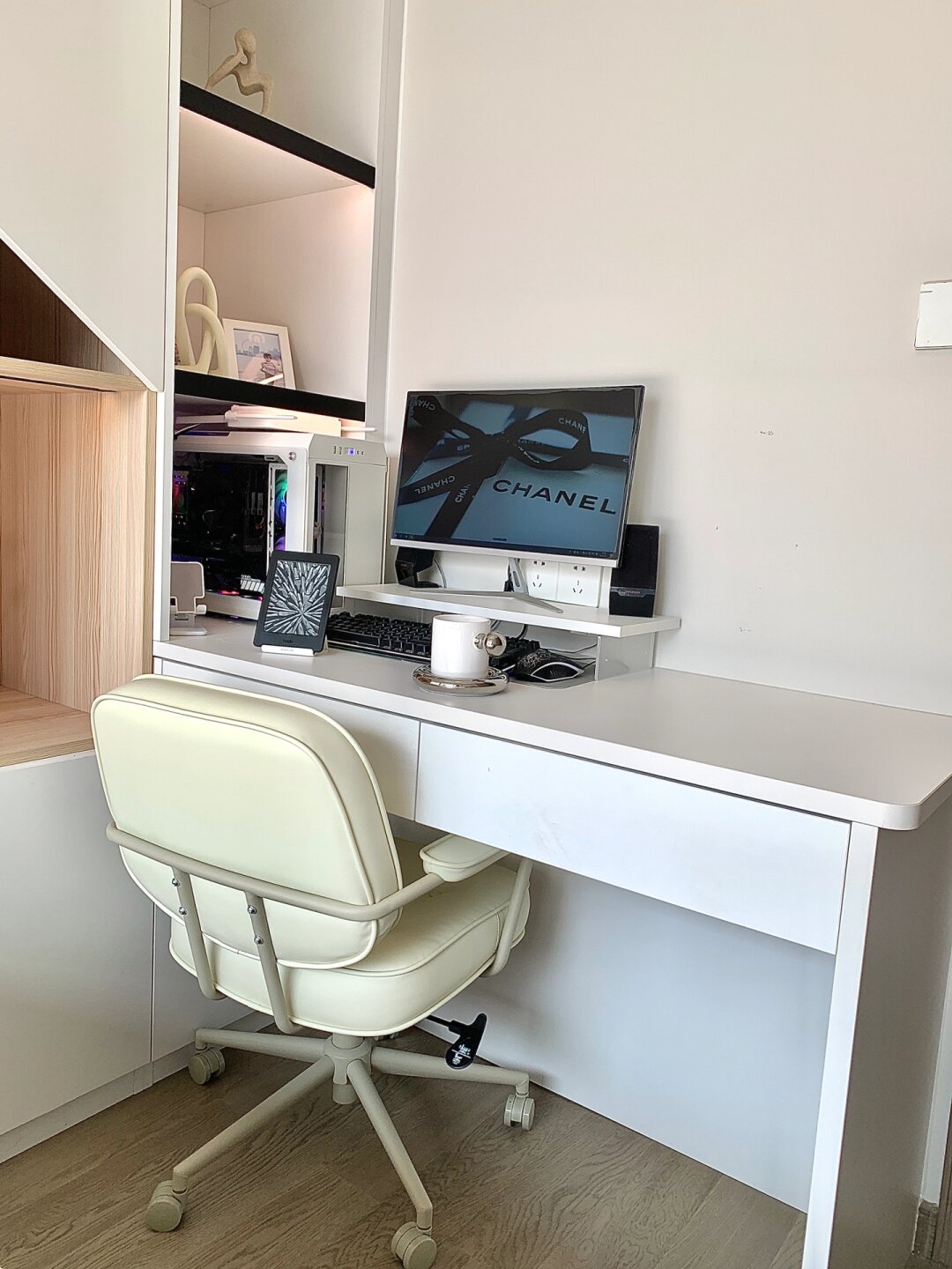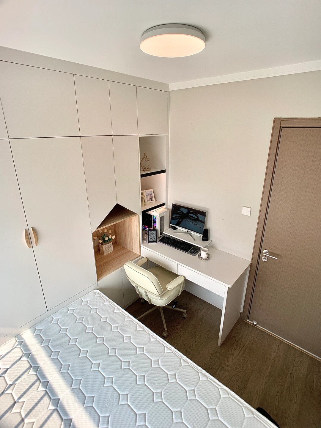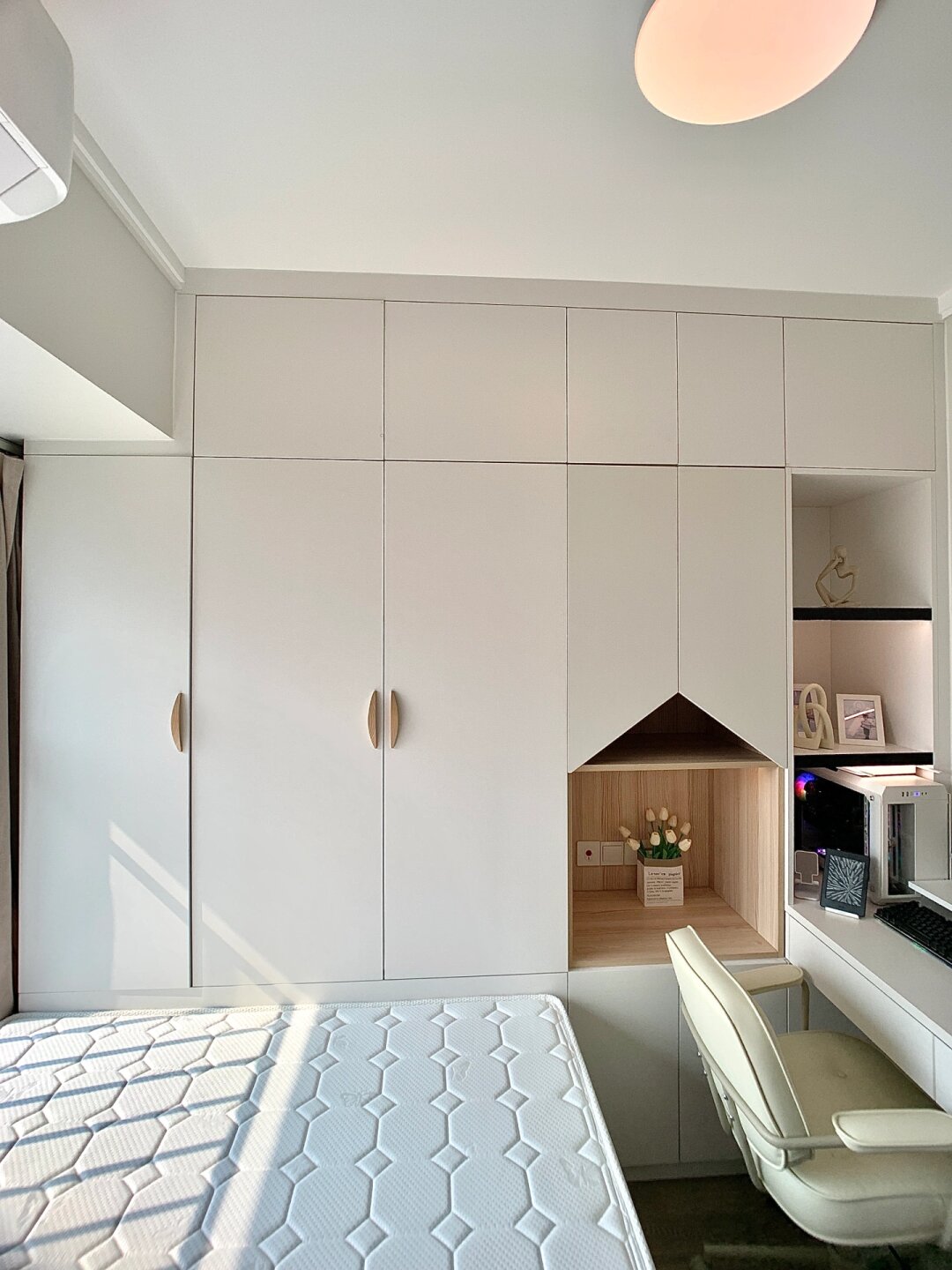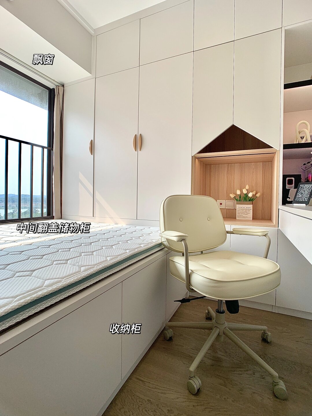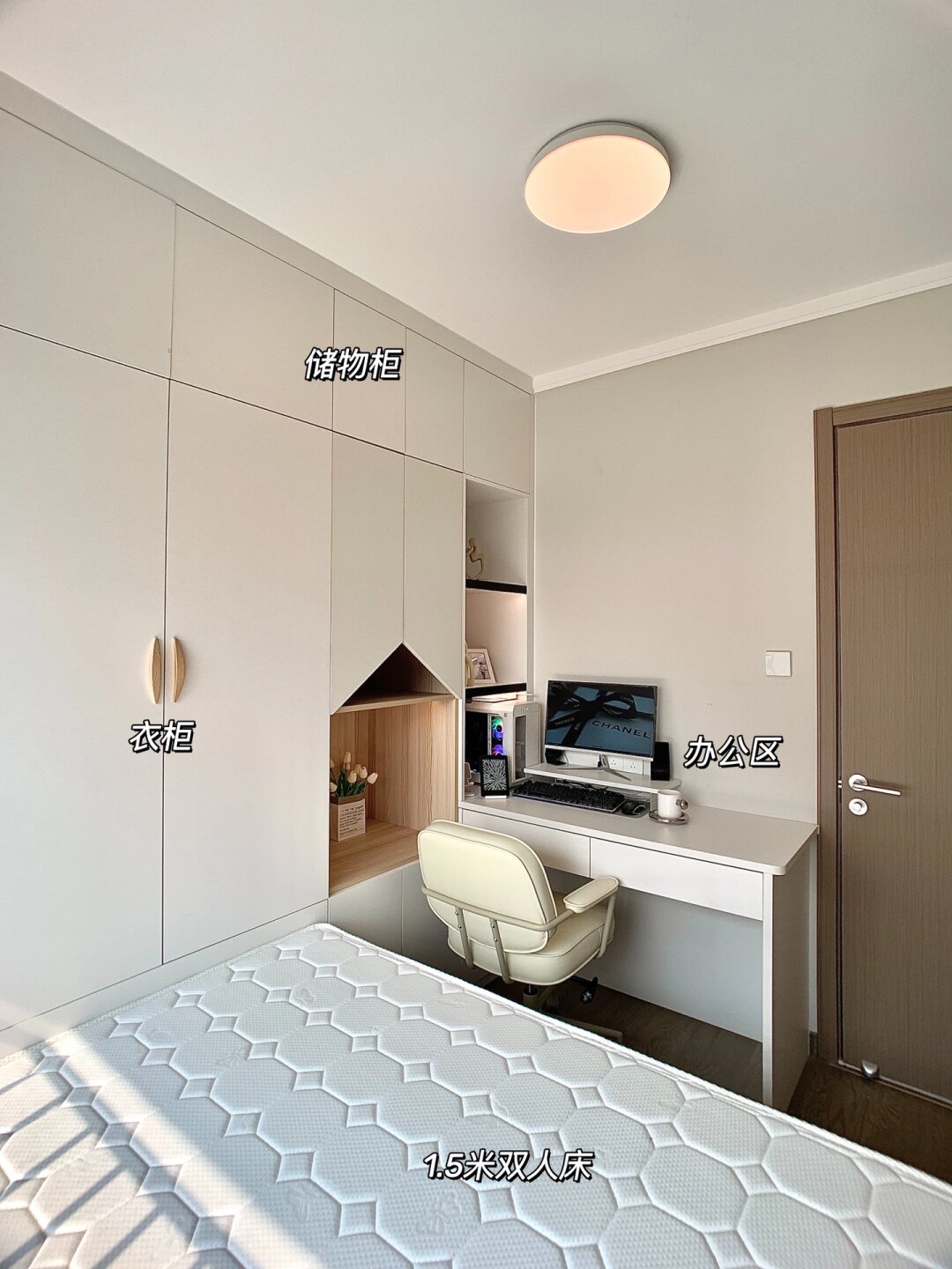 6平小次卧|有双人床有书桌有衣柜有储物柜 我家67平三房两卫今天和大家分享的是6平的次卧,房间尺寸是2.64m*2.66m。卧室面积不大,但是应有尽有,有1米5双人床,有书桌,有衣柜,还有储物柜。 双人床: 利用飘窗做的榻榻米设计,床体中间做翻盖储物格,放置使用频率不高的物品;床体外边做外开柜门,收纳大件家居用品等。 衣柜: 床尾设计平开门衣柜,深度50公分,柜体用的原木结构板,颜色是香榭白,开放格做了小房子造型设计。 书桌: 尺寸118*52,加上抽屉高度80cm,抽屉高度14cm,空间足够摆放台式电脑和动态本电脑。办公椅是米白色,坐垫柔软舒服,办公累了往后靠真放松,高度可调节,占地面积仅60cm,适合小户型。 关于大家常问的问题下面一一解答: Q:睡床边会不会冷? A:广州的天气不会那么冷,而且窗户有一定的封闭性,实在冷的时候还有暖气。 Q:飘窗上那个是梁吗?这样设计不好吧? A:是梁,小户型空间小,能利用则利用,将就点。 Q:榻榻米回南天潮湿发霉怎么办? A:我家选用的是防潮材质的原木结构板。
