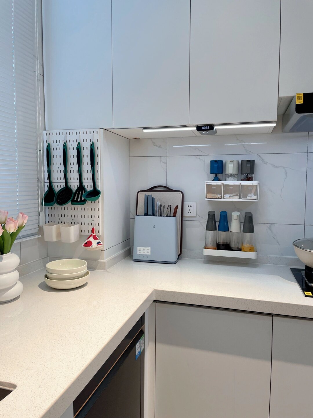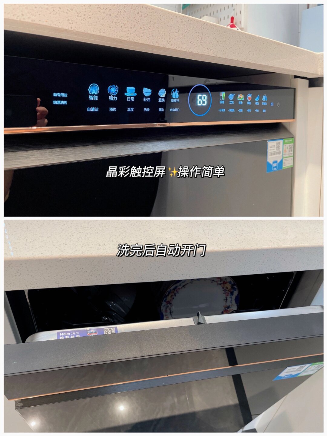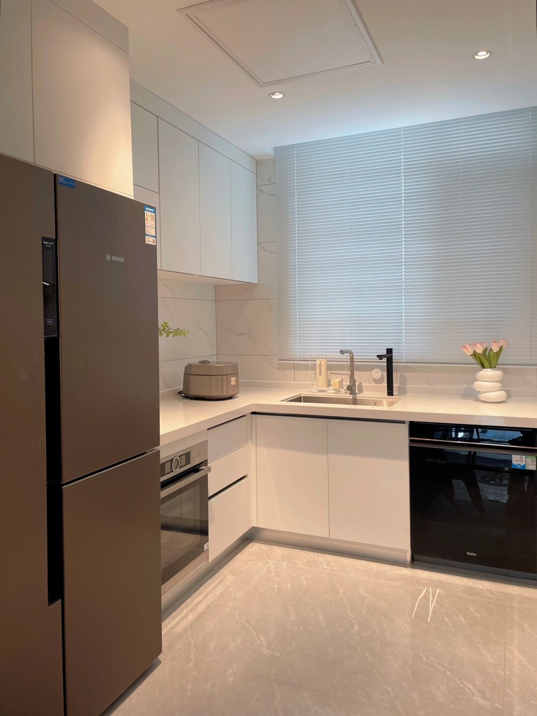 7㎡极简厨房|这真是我的理想厨房啊! 入住一年 还是我蕞喜欢的简约小厨房 因为家里是现代简约风设计 所以厨房瓷砖选了灰色 门板选了白色 厨房概况 尺寸:长2.8米 宽2.7米 地面:浅灰色亮面砖 墙面:白色花纹亮面砖 顶面:石膏板吊顶 橱柜:双饰面门板+隐形拉手 灯光:4个嵌入式射灯 色温3000K 动线设计 备菜区-洗菜区-切菜区-炒菜区-电器区-蒸烤区 动线合理才不会手忙脚乱 厨房电器 厨房虽小,但五脏俱全 装修前就规划好了插座水电位置,再根据电器尺寸定好柜体 嵌入式安装实现严丝合缝,不占空间又很美观。洗碗机是我家的必需品,海尔W5000洗碗机使用一段时间了,真的忍不住想夸夸它[嫌弃] 黑色面板跟我家的白色厨房真的好配,隐藏式把手也不会磕腿,无界晶彩大屏自带12种洗涤程序 简单又好操作 每到周末朋友来家里聚餐,才发觉15套的洗碗机是真的香!吃完饭后锅碗杯碟勺通通都塞进洗碗机。平时家里吃饭人少,就选择分区洗模式,省时节水 真正的做到了解放双手 没想到洗碗机洗的比我们手洗的干净多了[good] 它中间的喷淋臂是创新的H型,上下两面都能喷水冲洗,而且中间有2次80℃的高温蒸汽加快重油污溶解的同时能有效杀除99.999%的细菌。洗完之后还会自动开门烘干,拿出来的餐具都是干干爽爽的~最重要的是 烘干后可以继续存放在洗碗机内,7天内都可以长效储存,真的是买到我心坎里了! 洗碗机买对是真的很省事,幸福感 up up up~