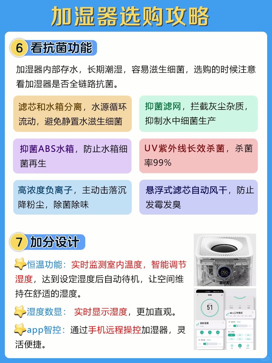 加湿器内部存水,长期潮湿,容易滋生细菌,选购的时候注意看加湿器是否全链路抗菌。比如滤芯和水箱分离的设计,选用抑菌滤网和抑菌ABS水箱,UV紫外线长效杀菌、负离子杀菌净化、悬浮式滤芯自动风干的功能。