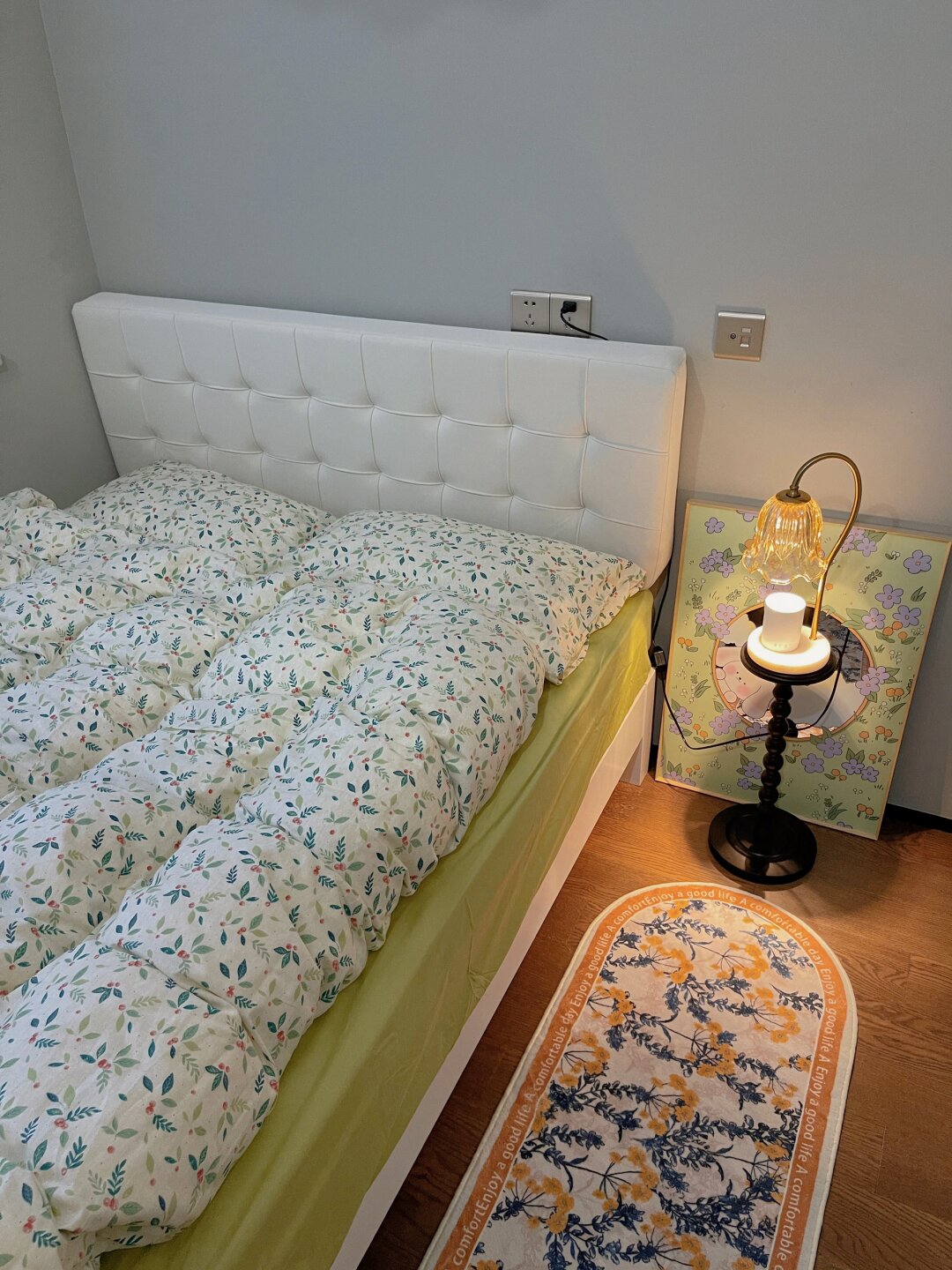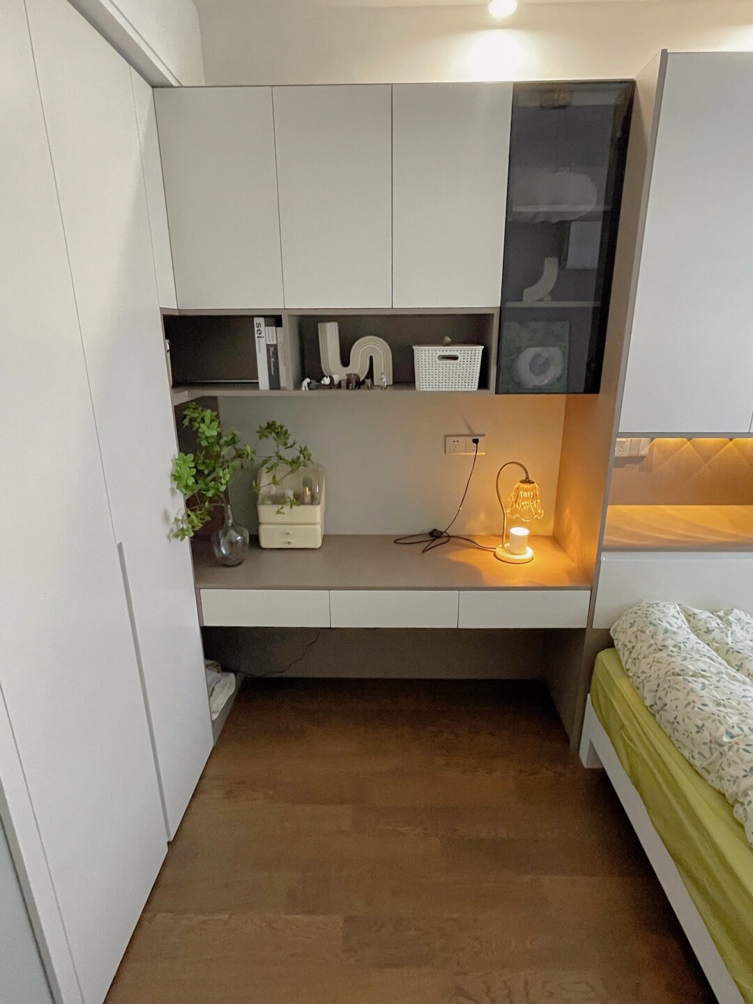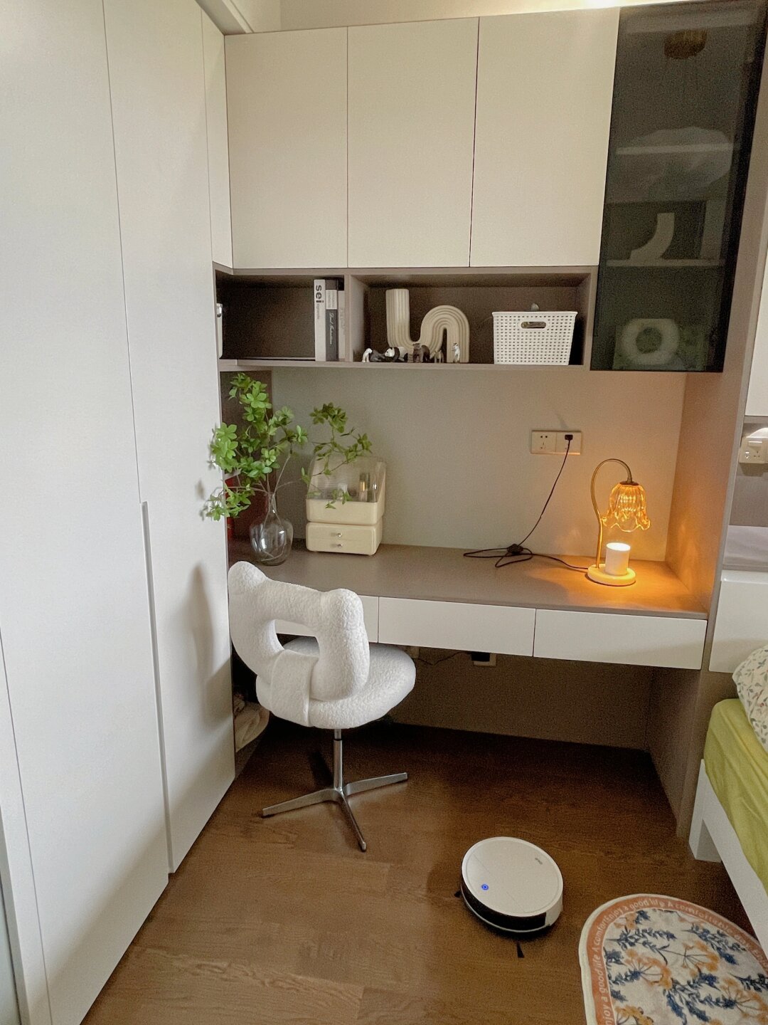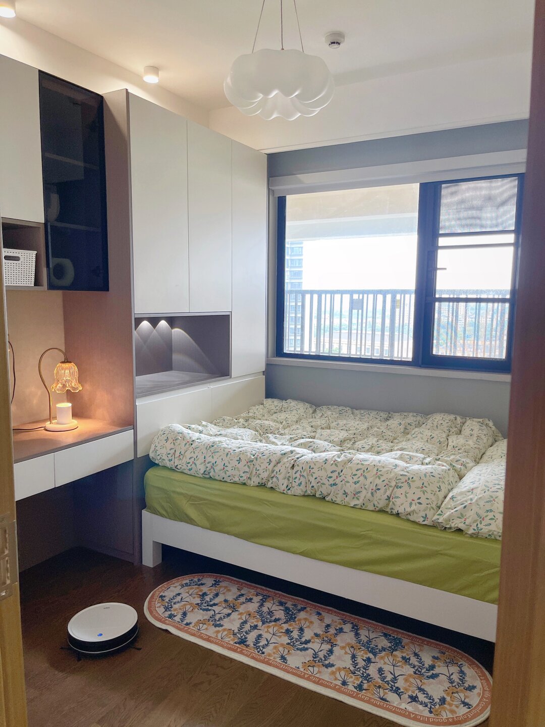 7 ㎡榻榻米多功能房 这样装yyds! 房间布局 榻榻米的床头跟书桌的左侧一体 榻榻米床头做了衣柜,衣物、被子等都可以收纳进去,相当于一个衣帽间的储物空间。 进门左手边就是一个一门到顶的内嵌大衣柜 与门平齐 深度55cm 储物空间超大 书桌:长1.48m 宽0.5m 高0.58m 床骨架:1.5m2m [微风] 一个可移动床头靠垫 窗帘:香格里拉帘 评论区经常有朋友问 床骨架的话床底怎么打扫呢?大概这从来不是我考虑的点 家里有个可以手机 控制的百 元“电 子保 姆” 超小一个,沙发旁腾双拖鞋的大小就能放 结束都会自己找到充电的窝~ 这是一个让我愿意沉浸且待很久的空间 用心布置后不再是平平无奇 又好看又实用还好睡~ 春意盎然 恰到好处的清新与治愈