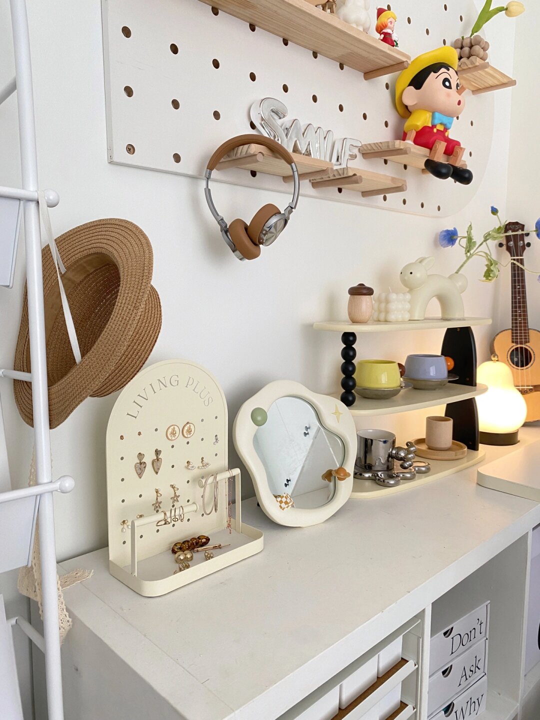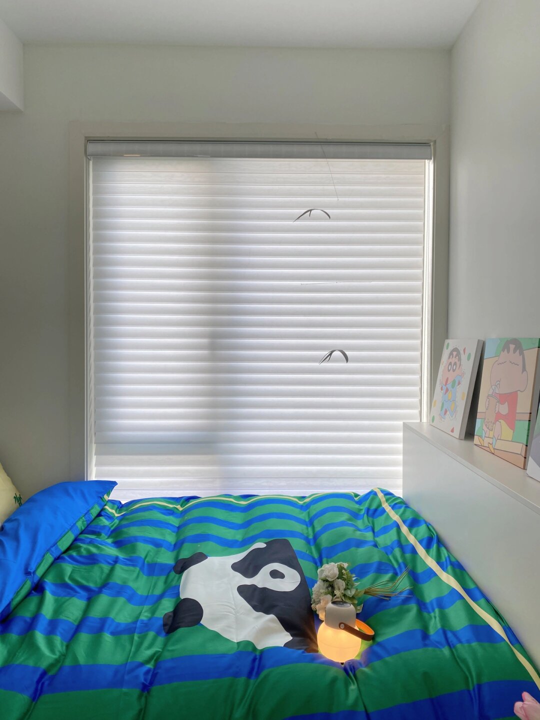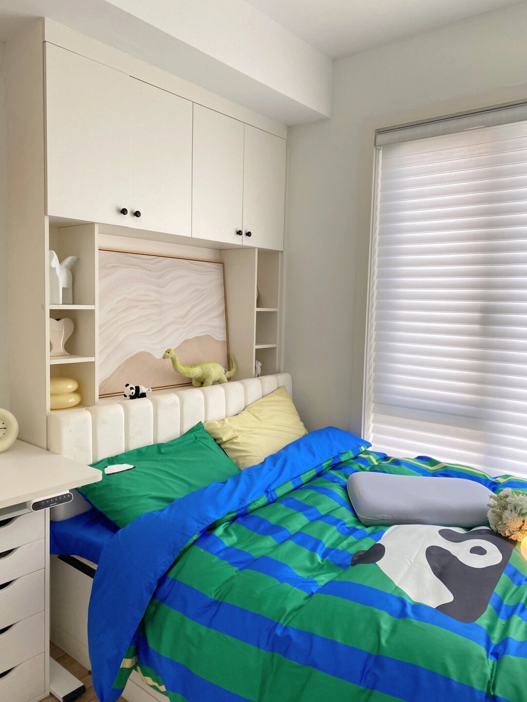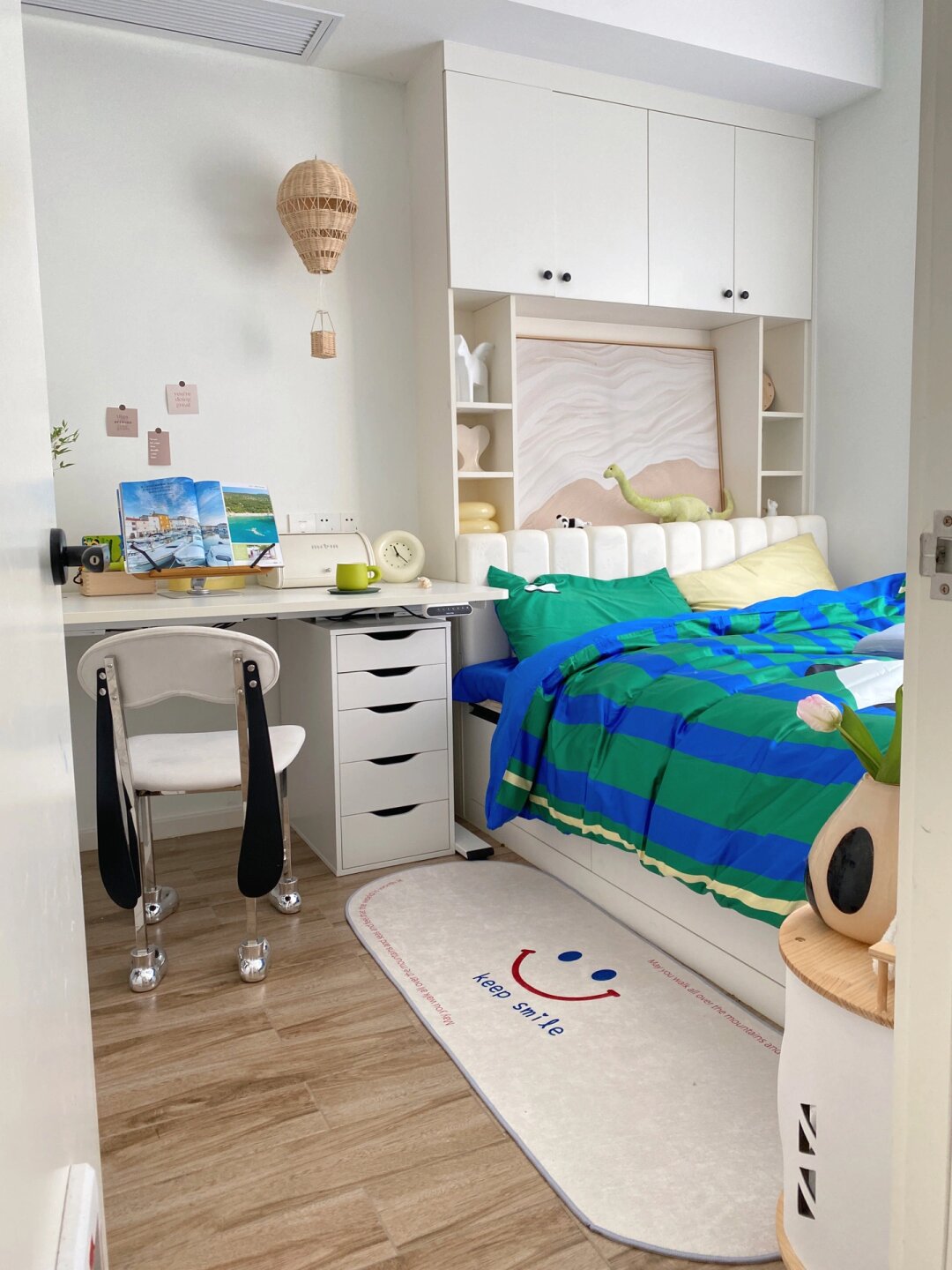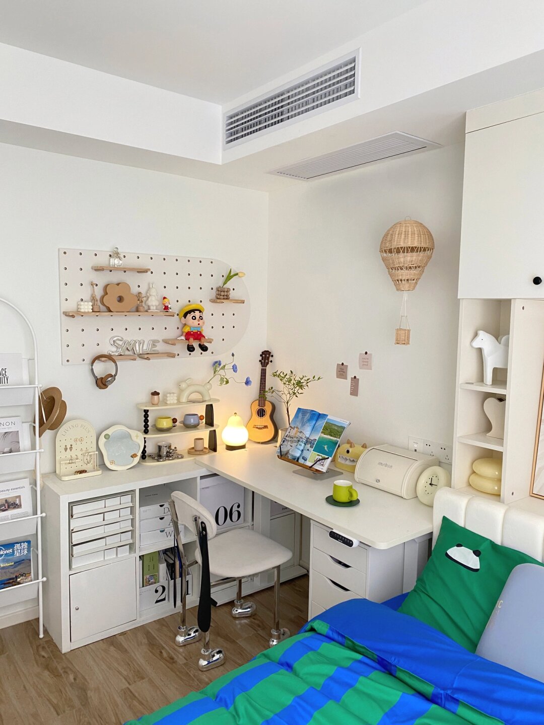 7 ㎡榻榻米房|L型半包围书桌真的太香了! 带飘窗的小卧室,延伸出来做了榻榻米。书桌做成了L型半包围书桌,不仅美貌又实用,安全感满满! 关于卧室尺寸 面积:长2.5米,宽3米,共7.5平 榻榻米床:长2米,高0.42米,宽1.5米 学习桌:长1.1米,宽0.65米,高0.58-0.81米 八格柜:长1.47米,宽0.39米,高0.77米 卧室布置 墙面是莲花白,温柔、干净又显大 窗帘是半透光香格里拉帘,明亮又好看 墙面安装了木质洞洞板,摆上可爱的摆件,让空间更生动 关于学习区 1.1米学习桌搭配八格柜,就组成了好看又实用的L型书桌。 关于睡眠区 1.5*2米的大床,炎炎夏日,铺上冰冰凉的四件套和凉皮枕,给小卧室都增添了一丝清凉。 地上铺上床边毯,舒服又好看~ - 真的太喜欢我的半包围榻榻米房啦!