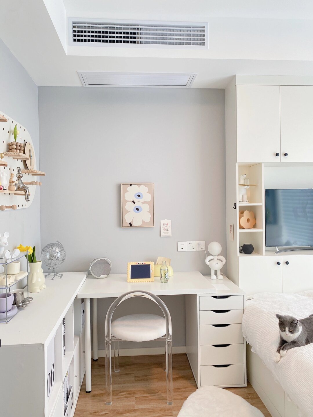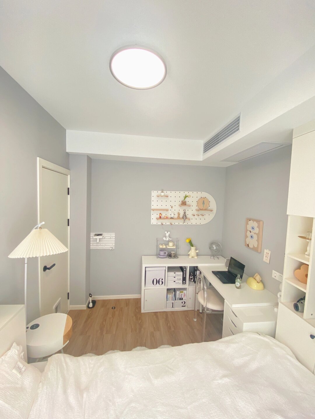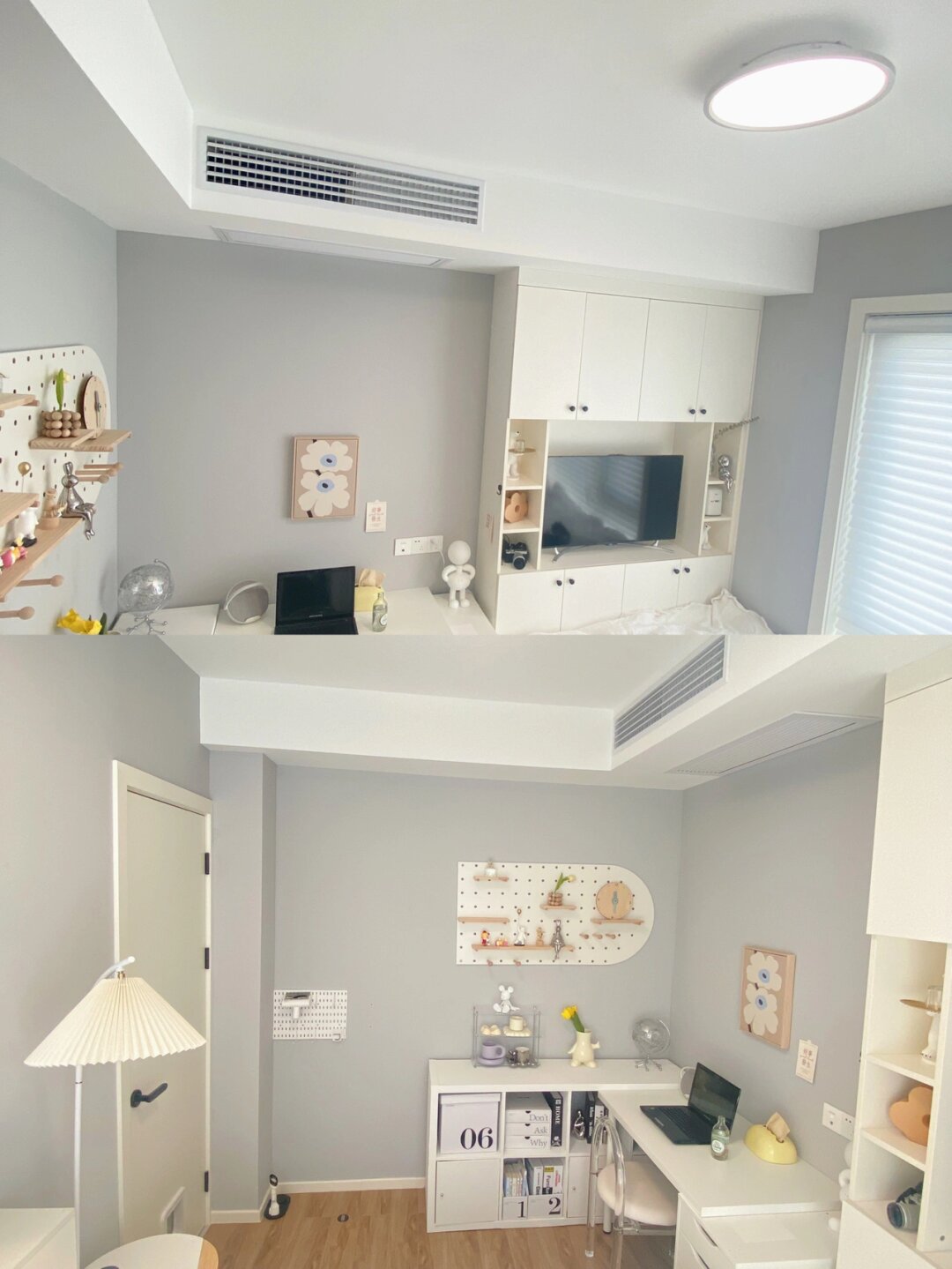 7 ㎡榻榻米房改造|改完老公和我抢着用! 这间卧室是我家面积zui小的房间,只有7个平方。之前一直没有分享过,因为一直觉得太丑了 上周末用了两天改造了一番~让它变成集休息、书房、收纳为一体的多功能房~ 关于硬装 装修时唯独这间房是队友做主的 婴儿蓝的乳胶漆 奶白色榻榻米1.5*2m 榻榻米柜子格局都是他自己要求的 (就想问问除了我家还有人家的榻榻米柜子里安电视的吗) - 下面看看我改了哪些软装吧 [微风] 关于吸顶灯 最先换掉的就是之前的频闪很严重的灯。 这个房间是队友平时加班工作使用的,时间久了他也经常说眼睛累,索性给他换了一盏护眼灯。 做了好多功课,它是专为护眼打造的,和很多幼儿园有合作,还有十年质保,之后宝宝上学了在这间房念书写字也可以用了~ 极简的款式,边框是全金属的,不用担心用久会有有害物质~很适合我这个mini room. - [微风] 关于书桌台 书桌:宜家利蒙 长1米 抽屉柜:宜家阿莱斯 五斗柜很能装 8格柜:宜家卡莱克 1.47*0.77*0.39米 终于拥有了心心念念的L型书桌台了,收纳空间立马增加了很多,颜值也很高。 墙面上还放了一块木质洞洞板,给房间增添了不少有趣~ - [微风] 关于窗帘 之前的窗帘是拼色的(队友自己选的),被我嫌弃了好久。 这次换了香格里拉帘,半透光的,装上感觉房间都变干净清爽了不少,有阳光的话有光影更好看 - 今天就分享这些啦~ 有兴趣的话下次分享我这个奇怪榻榻米的尺寸