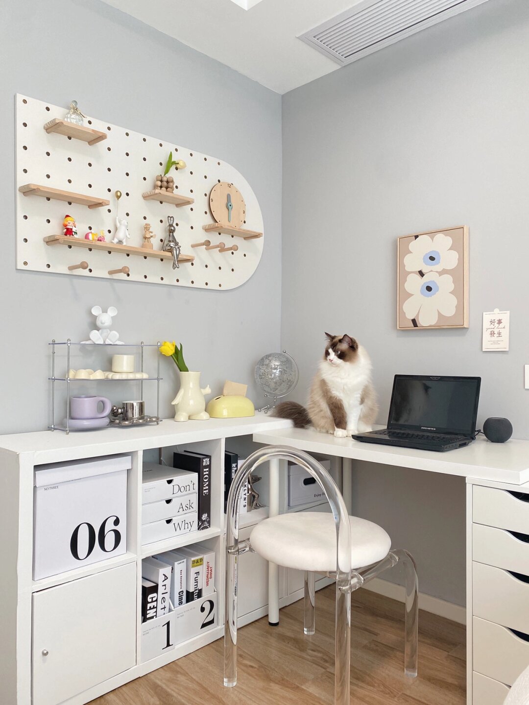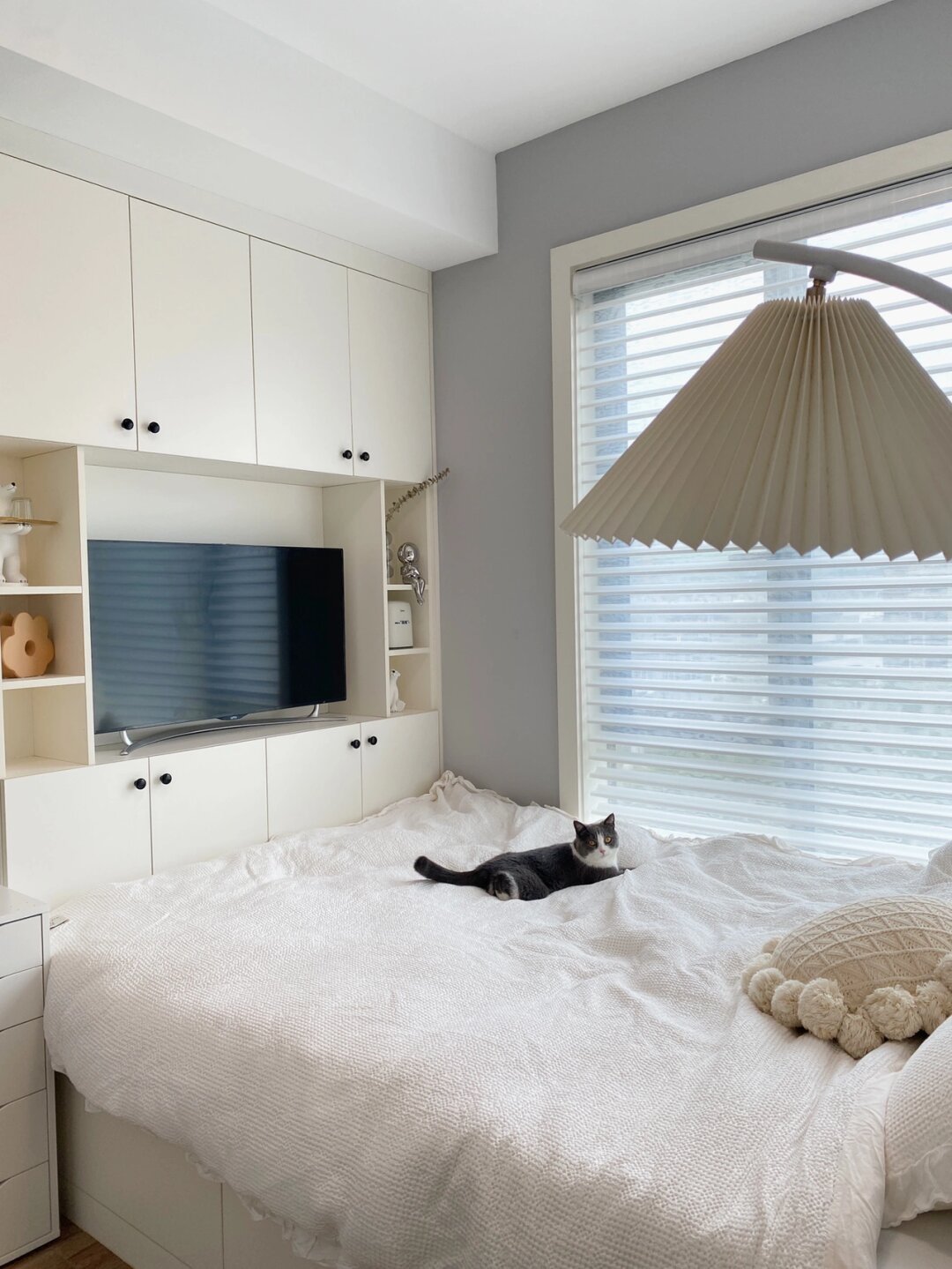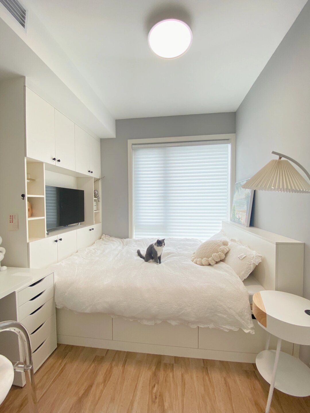 7 ㎡榻榻米房改造|改完老公和我抢着用! 这间卧室是我家面积zui小的房间,只有7个平方。之前一直没有分享过,因为一直觉得太丑了 上周末用了两天改造了一番~让它变成集休息、书房、收纳为一体的多功能房~ 关于硬装 装修时唯独这间房是队友做主的 婴儿蓝的乳胶漆 奶白色榻榻米1.5*2m 榻榻米柜子格局都是他自己要求的 (就想问问除了我家还有人家的榻榻米柜子里安电视的吗) - 下面看看我改了哪些软装吧 [微风] 关于吸顶灯 最先换掉的就是之前的频闪很严重的灯。 这个房间是队友平时加班工作使用的,时间久了他也经常说眼睛累,索性给他换了一盏护眼灯。 做了好多功课,它是专为护眼打造的,和很多幼儿园有合作,还有十年质保,之后宝宝上学了在这间房念书写字也可以用了~ 极简的款式,边框是全金属的,不用担心用久会有有害物质~很适合我这个mini room. - [微风] 关于书桌台 书桌:宜家利蒙 长1米 抽屉柜:宜家阿莱斯 五斗柜很能装 8格柜:宜家卡莱克 1.47*0.77*0.39米 终于拥有了心心念念的L型书桌台了,收纳空间立马增加了很多,颜值也很高。 墙面上还放了一块木质洞洞板,给房间增添了不少有趣~ - [微风] 关于窗帘 之前的窗帘是拼色的(队友自己选的),被我嫌弃了好久。 这次换了香格里拉帘,半透光的,装上感觉房间都变干净清爽了不少,有阳光的话有光影更好看 - 今天就分享这些啦~ 有兴趣的话下次分享我这个奇怪榻榻米的尺寸